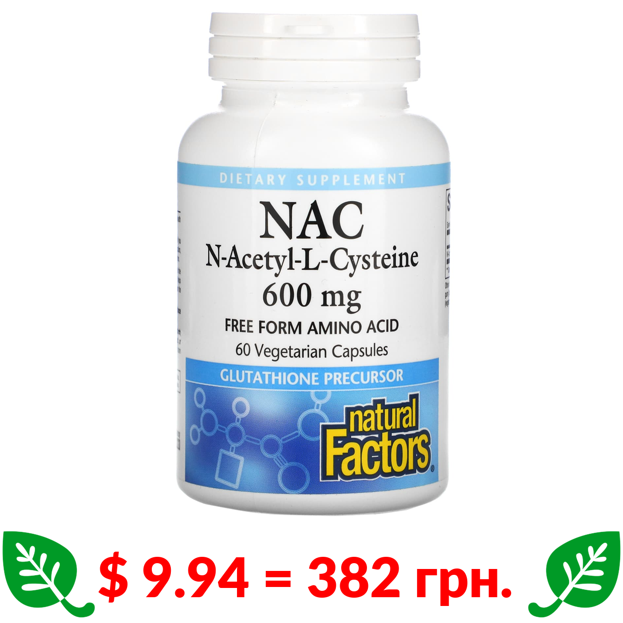 $ 9.94 = 382 грн. Natural Factors, NAC, N-Acetyl-L-Cysteine, 600 mg, 60 Vegetarian Capsules