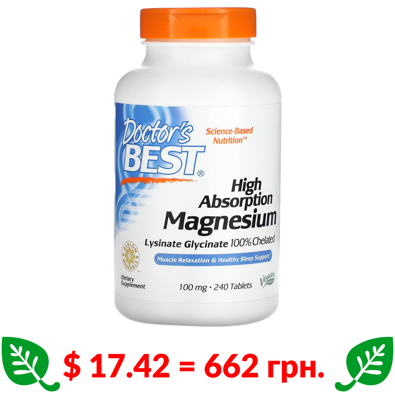 $ 17.42 = 662 грн. ????️ у кошику ????️ Doctor’s Best, High Absorption Magnesium, 100 mg, 240 Tablets