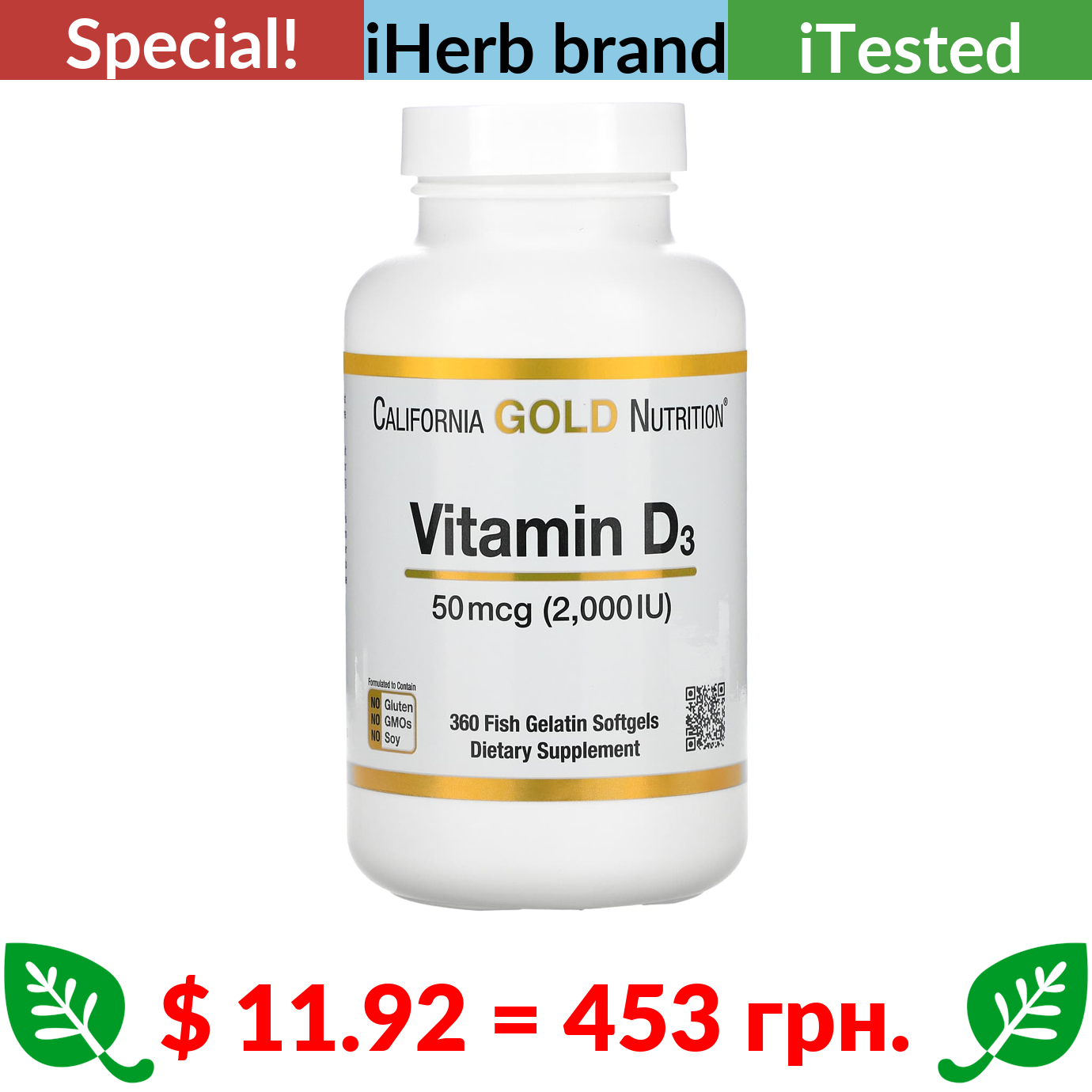$ 11.92 = 453 грн. ???? cуперакція! ???? California Gold Nutrition, Vitamin D3, 50 mcg (2,000 IU), 360 Fish Gelatin Softgels