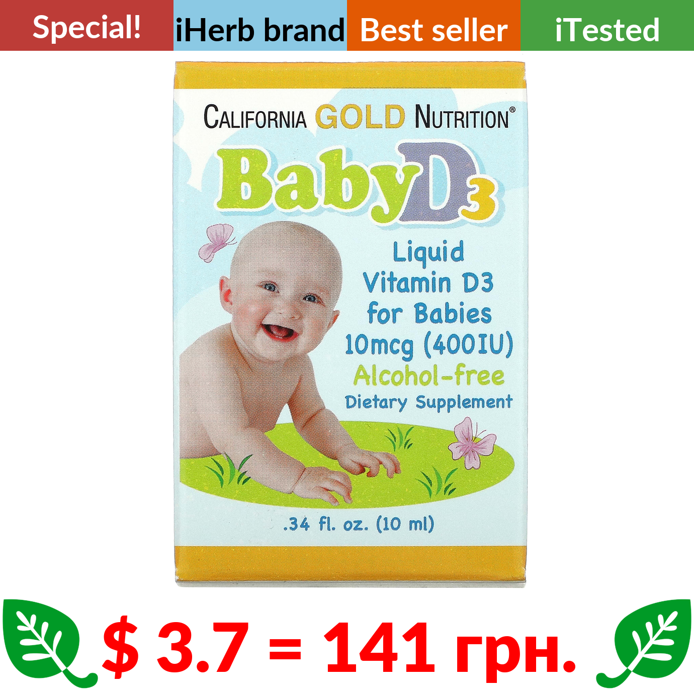 $ 3.7 = 141 грн. ???? cуперакція! ???? California Gold Nutrition, Baby Vitamin D3 Liquid, 10 mcg (400 IU), 0.34 fl oz (10 ml)