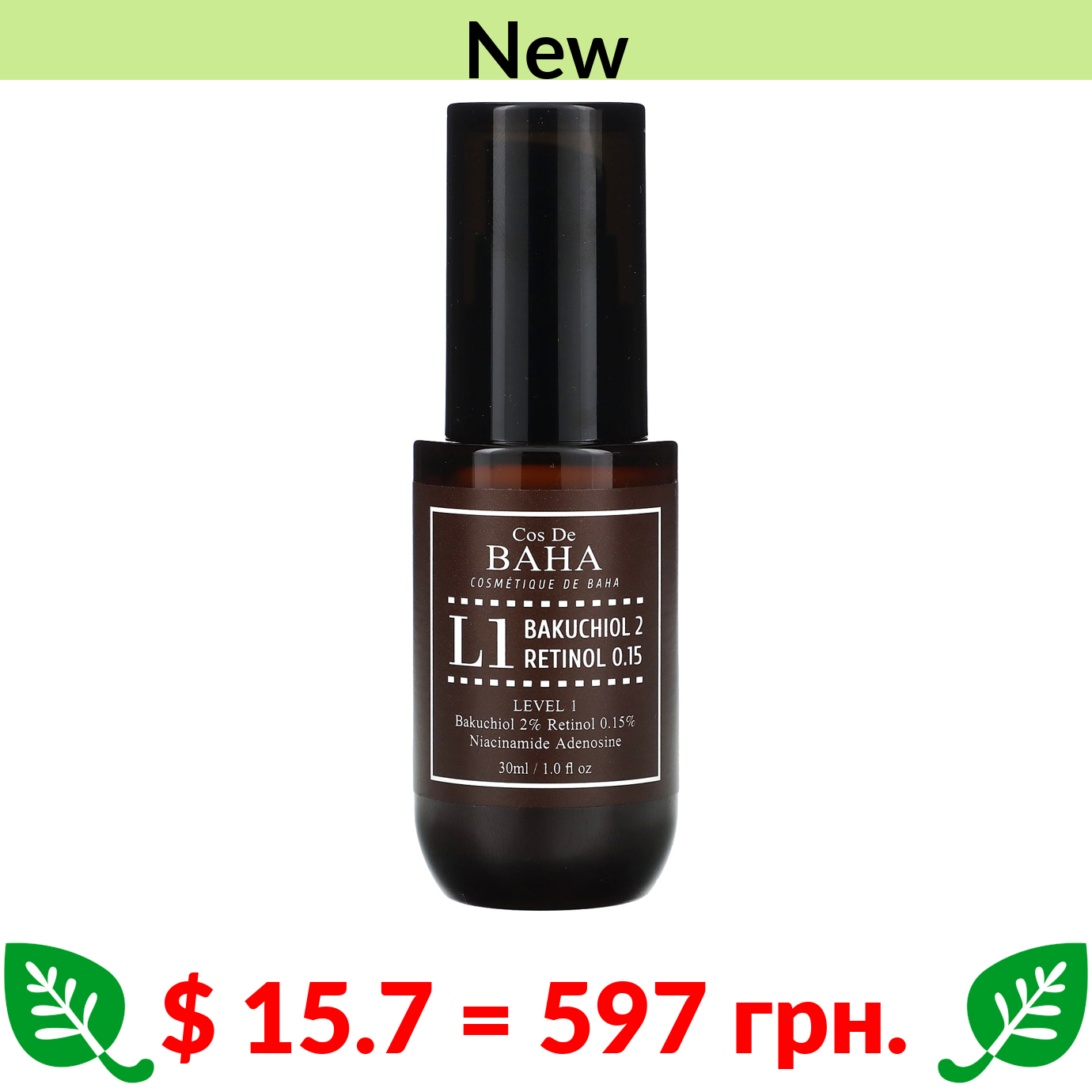 $ 15.7 = 597 грн. ????️ у кошику ????️ Cos De BAHA, L1, Bakuchiol 2 Retinol 0.15 Serum, 1 fl oz (30 ml)