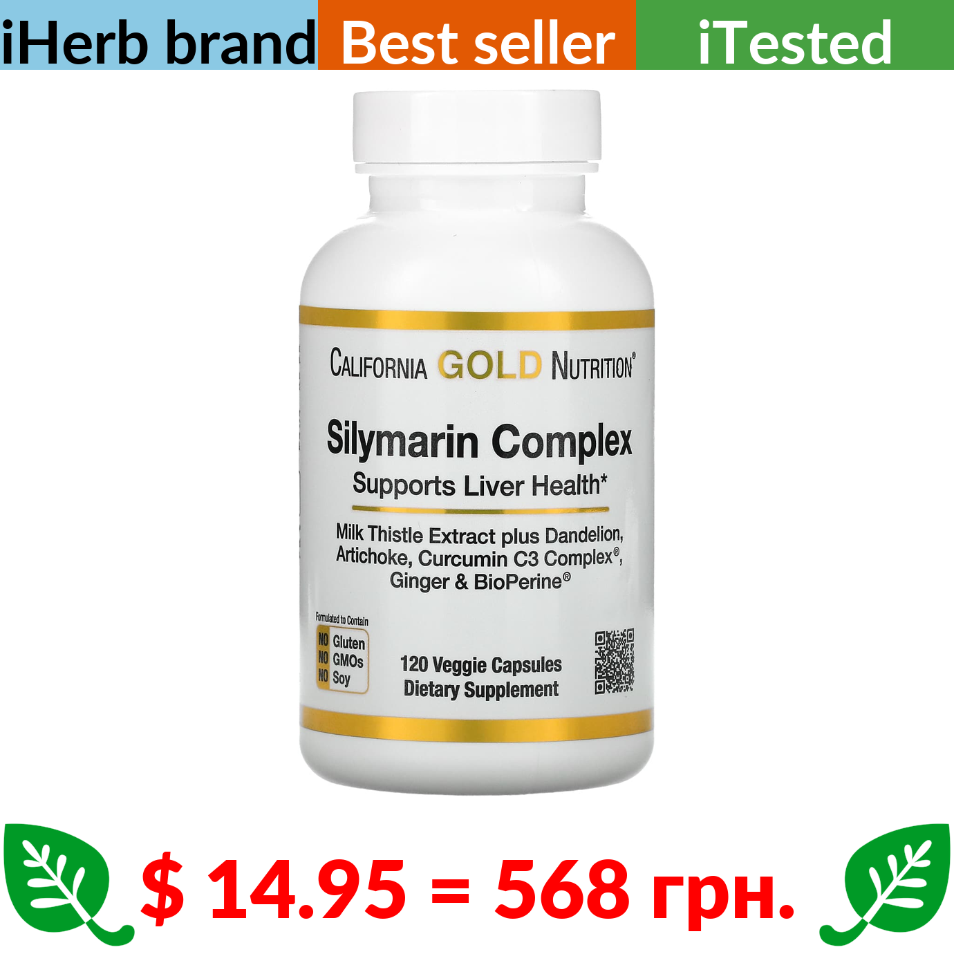 $ 14.95 = 568 грн. California Gold Nutrition, Silymarin Complex, Milk Thistle Extract Plus Dandelion, Artichoke, Curcumin C3 Complex®, Ginger, and BioPerine®, 120 Veggie Capsules