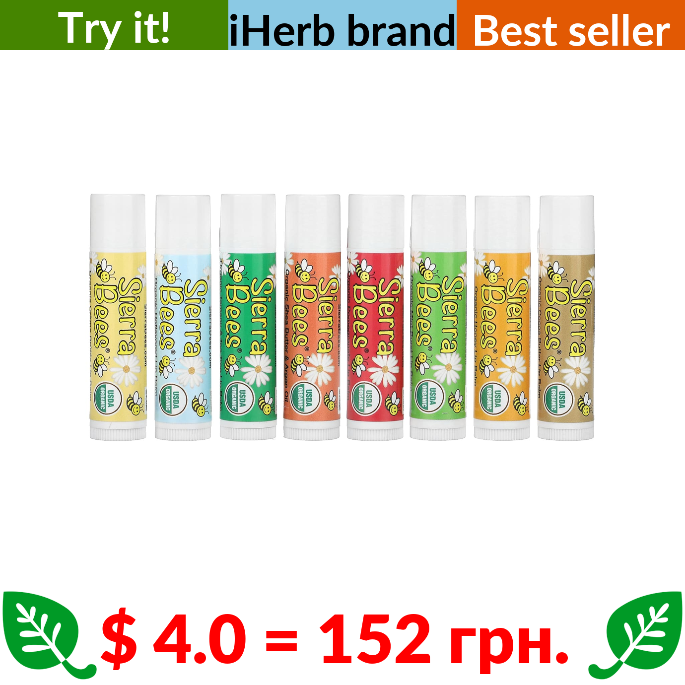 $ 4.0 = 152 грн. ???? варто спробувати ???? Sierra Bees, Organic Lip Balms Combo Pack, 8 Pack, 0.15 oz (4.25 g) Each