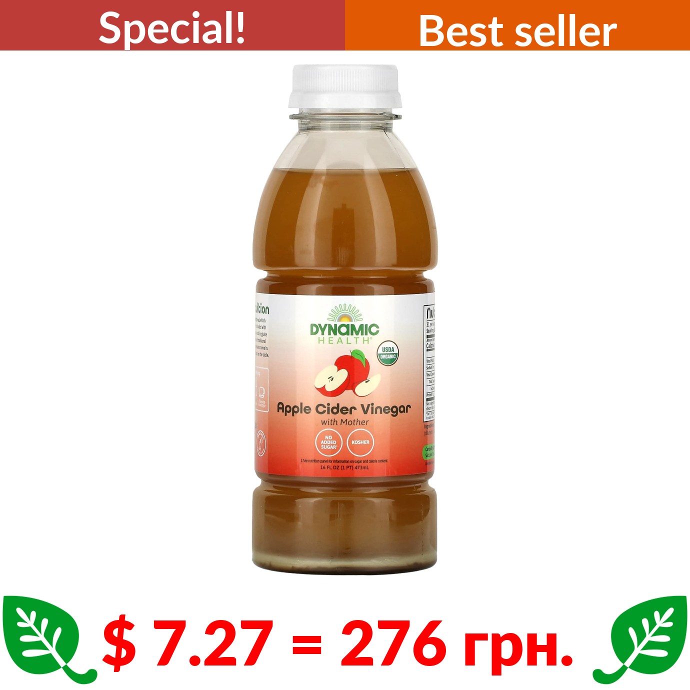 $ 7.27 = 276 грн. ???? cуперакція! ???? Dynamic Health, Apple Cider Vinegar with Mother, 16 fl oz (473 ml)