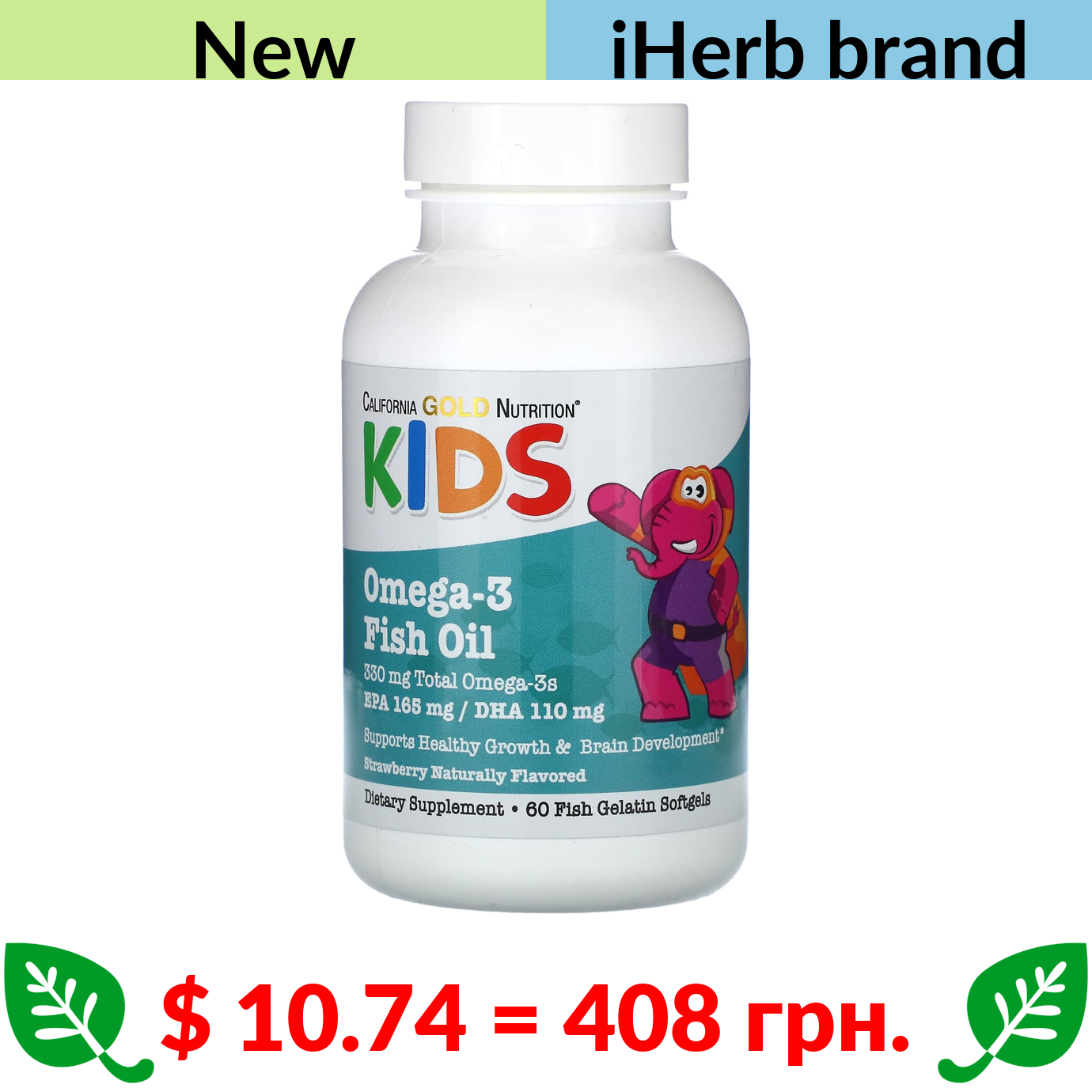 $ 10.74 = 408 грн. ????️ у кошику ????️ California Gold Nutrition, Kid’s Omega-3 Fish Oil, Natural Strawberry Flavor, 60 Fish Gelatin Softgels