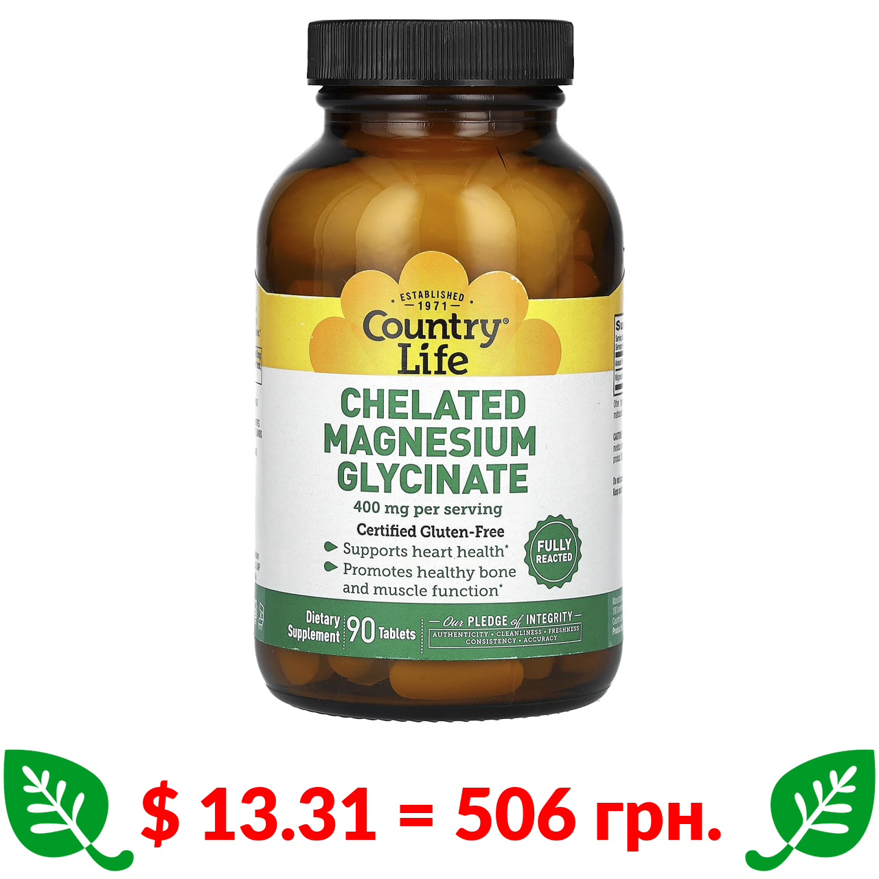 $ 13.31 = 506 грн. ????️ у кошику ????️ Country Life, Chelated Magnesium Glycinate, 400 mg, 90 Tablets (133 mg per Tablet )