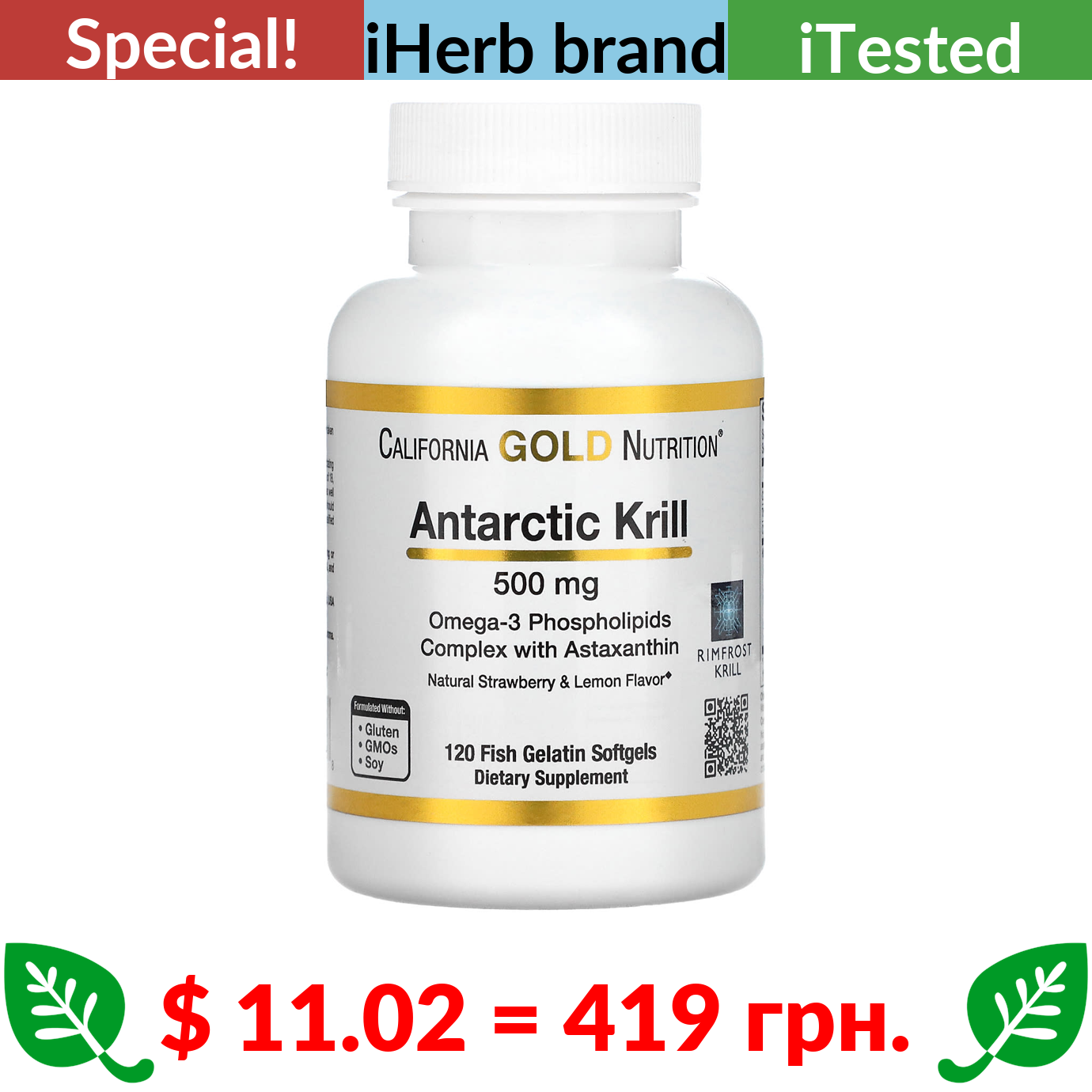 $ 11.02 = 419 грн. ???? cуперакція! ???? California Gold Nutrition, Antarctic Krill Oil, Omega-3 Phospholipids Complex with Astaxanthin, Natural Strawberry and Lemon Flavor, 500 mg, 120 Fish Gelatin Softgels