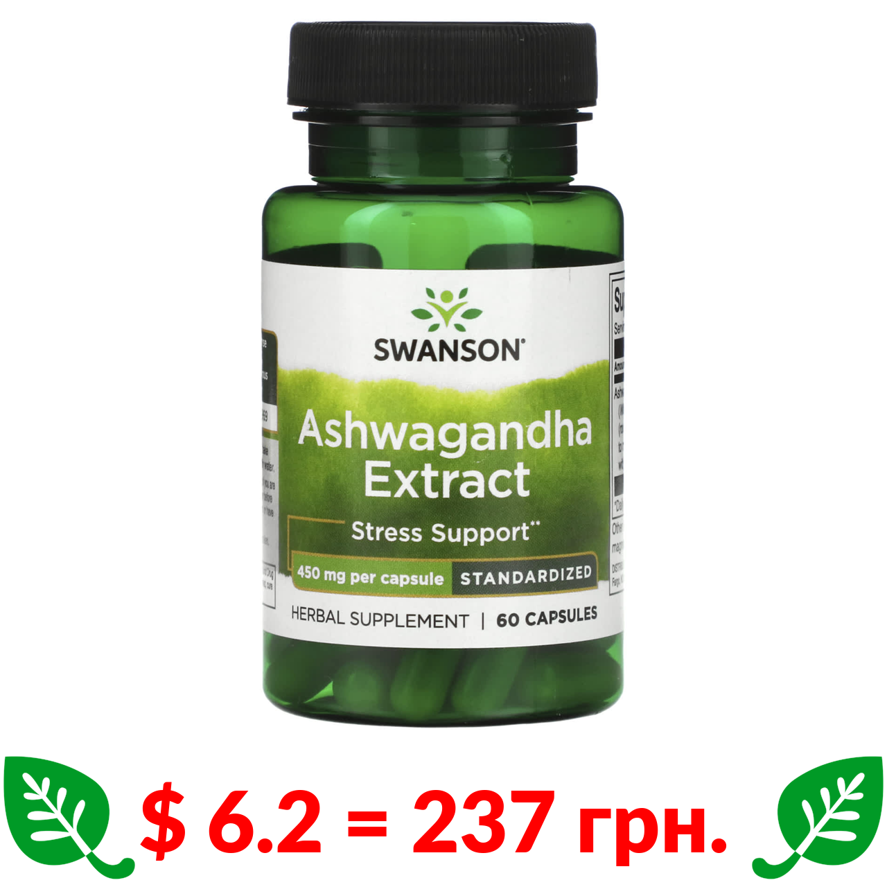 $ 6.2 = 237 грн. Swanson, Ashwagandha Extract, Standardized, 450 mg, 60 Capsules