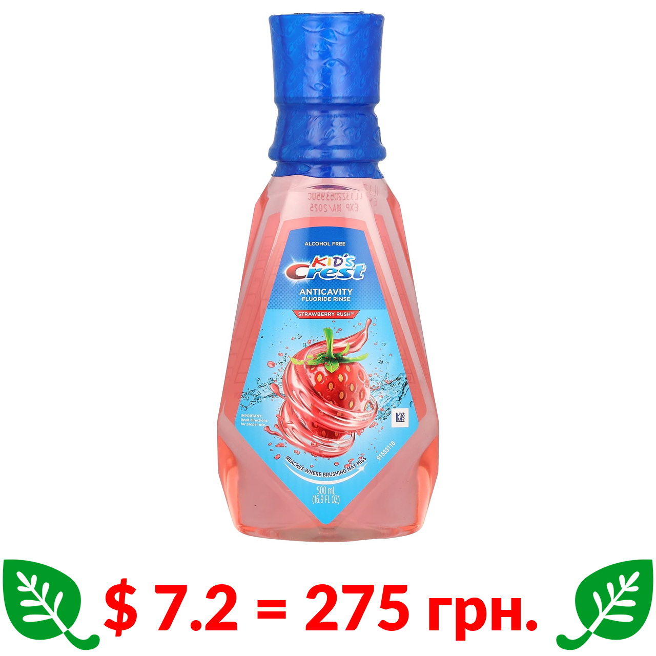 $ 7.2 = 275 грн. Crest, Kids, Anticavity Fluoride Rinse, Alcohol Free, Strawberry Rush, 16.9 fl oz (500 ml)