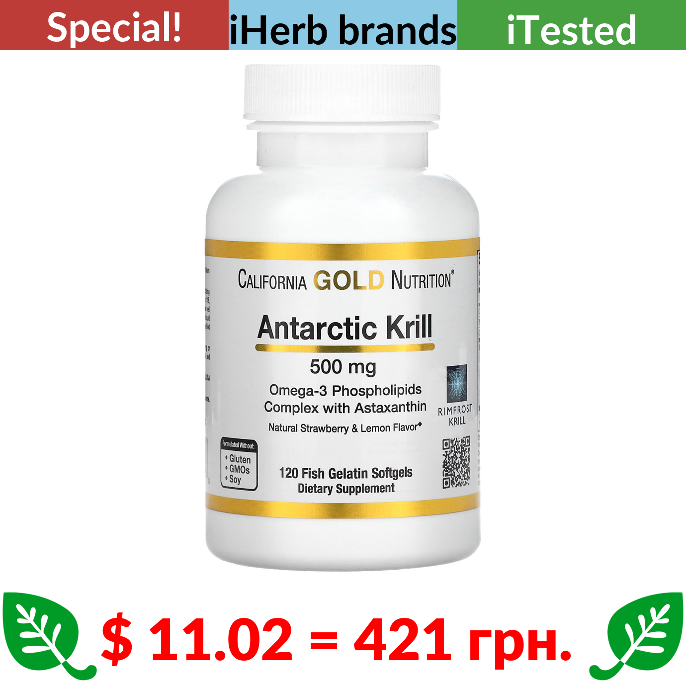 $ 11.02 = 421 грн. ???? cуперакція! ???? California Gold Nutrition, Antarctic Krill Oil, Omega-3 Phospholipids Complex with Astaxanthin, Natural Strawberry and Lemon Flavor, 500 mg, 120 Fish Gelatin Softgels