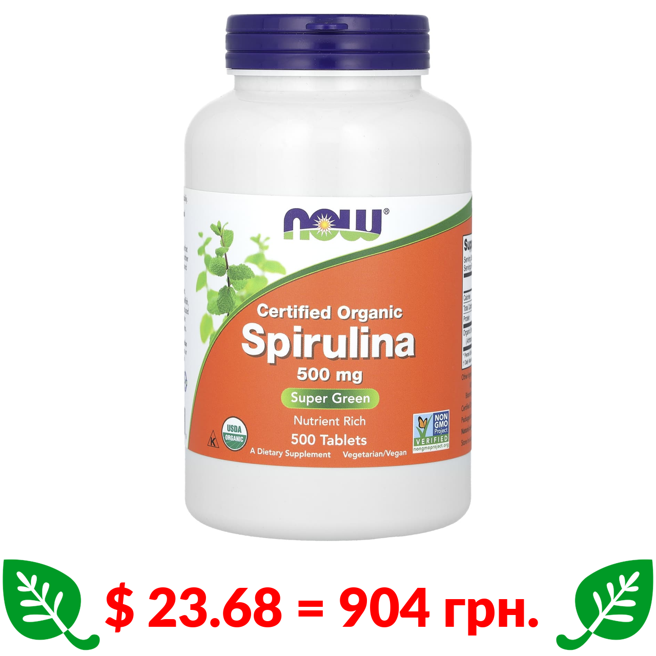 $ 23.68 = 904 грн. NOW Foods, Certified Organic Spirulina, 3,000 mg, 500 Tablets (500 mg Per Tablet)