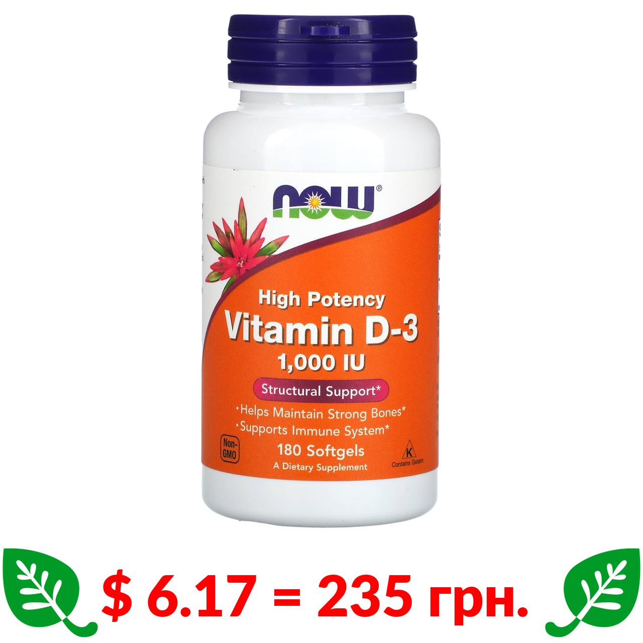 $ 6.17 = 235 грн. NOW Foods, Vitamin D-3, High Potency, 1,000 IU, 180 Softgels