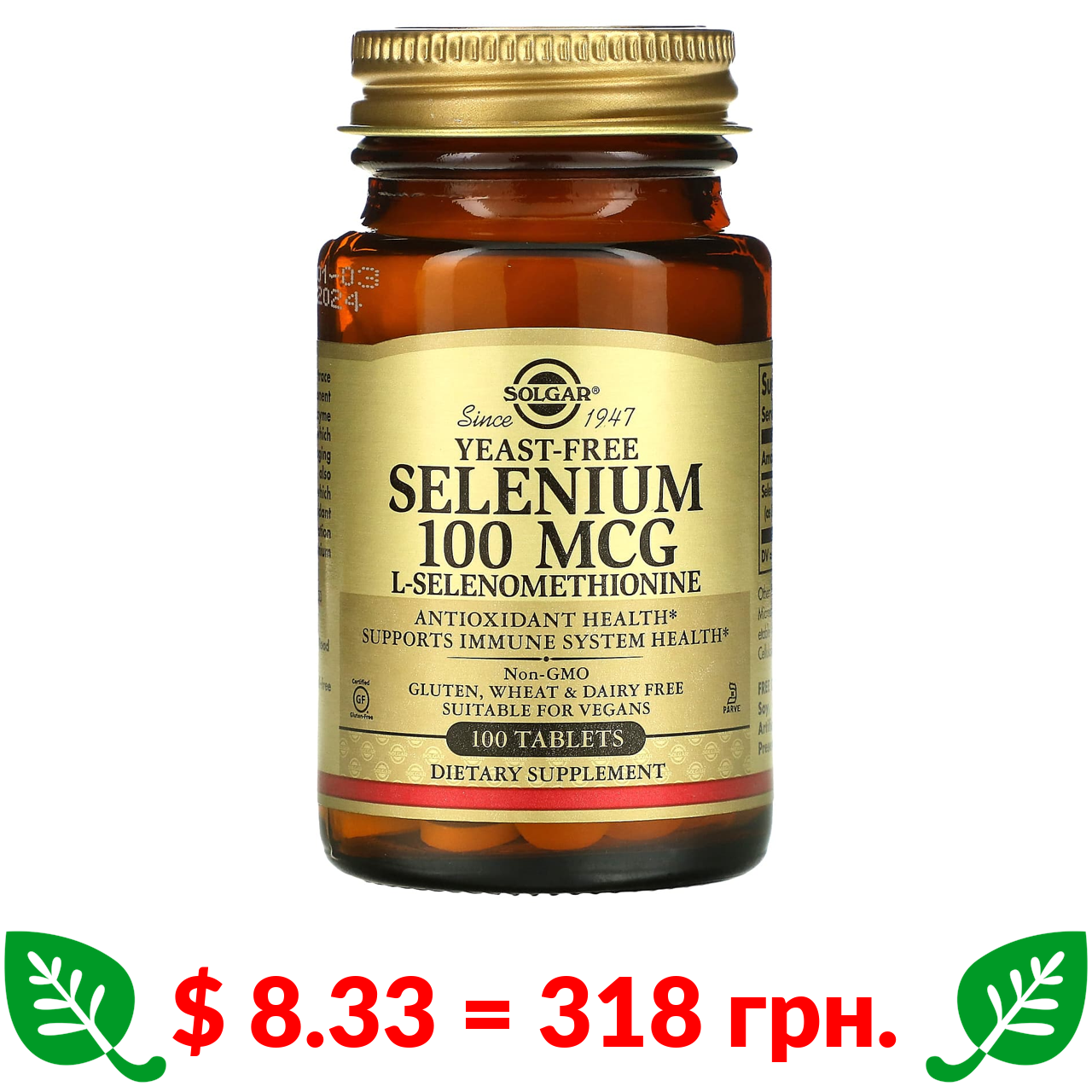 $ 8.33 = 318 грн. Solgar, Selenium, Yeast-Free, 100 mcg, 100 Tablets