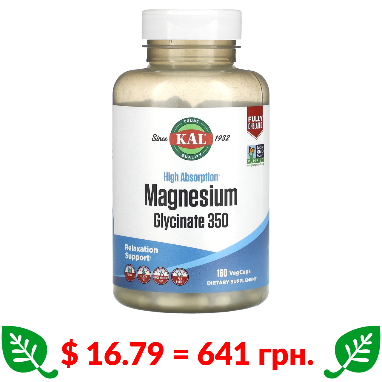 $ 16.79 = 641 грн. ????️ у кошику ????️ KAL, High Absorption Magnesium Glycinate 350, 160 VegCaps