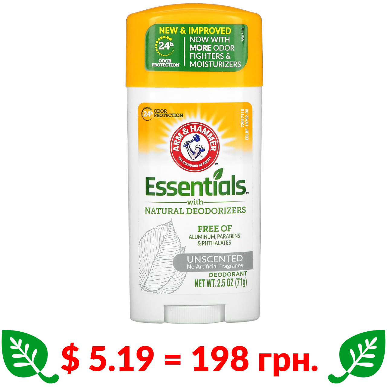 $ 5.19 = 198 грн. Arm & Hammer, Essentials with Natural Deodorizers, Deodorant, Unscented, 2.5 oz (71 g)