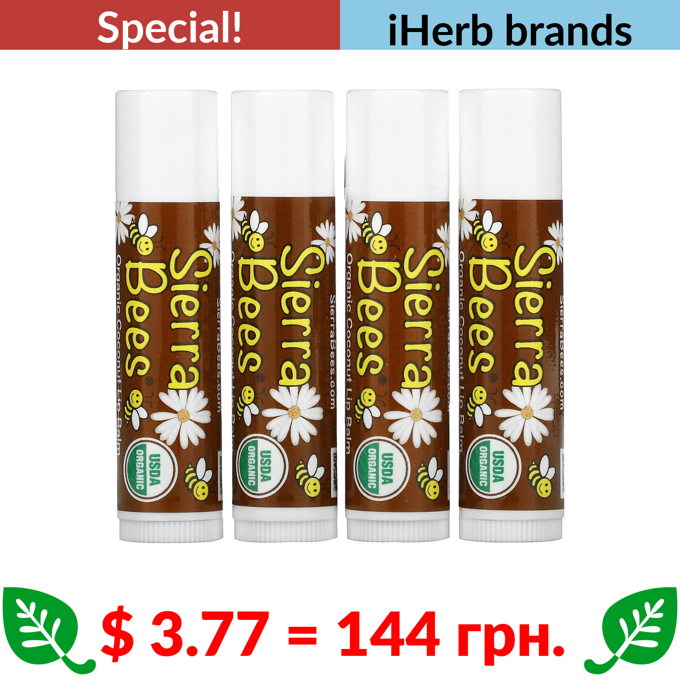 $ 3.77 = 144 грн. ???? cуперакція! ???? Sierra Bees, Organic Lip Balms, Coconut, 4 Pack, 0.15 oz (4.25 g) Each