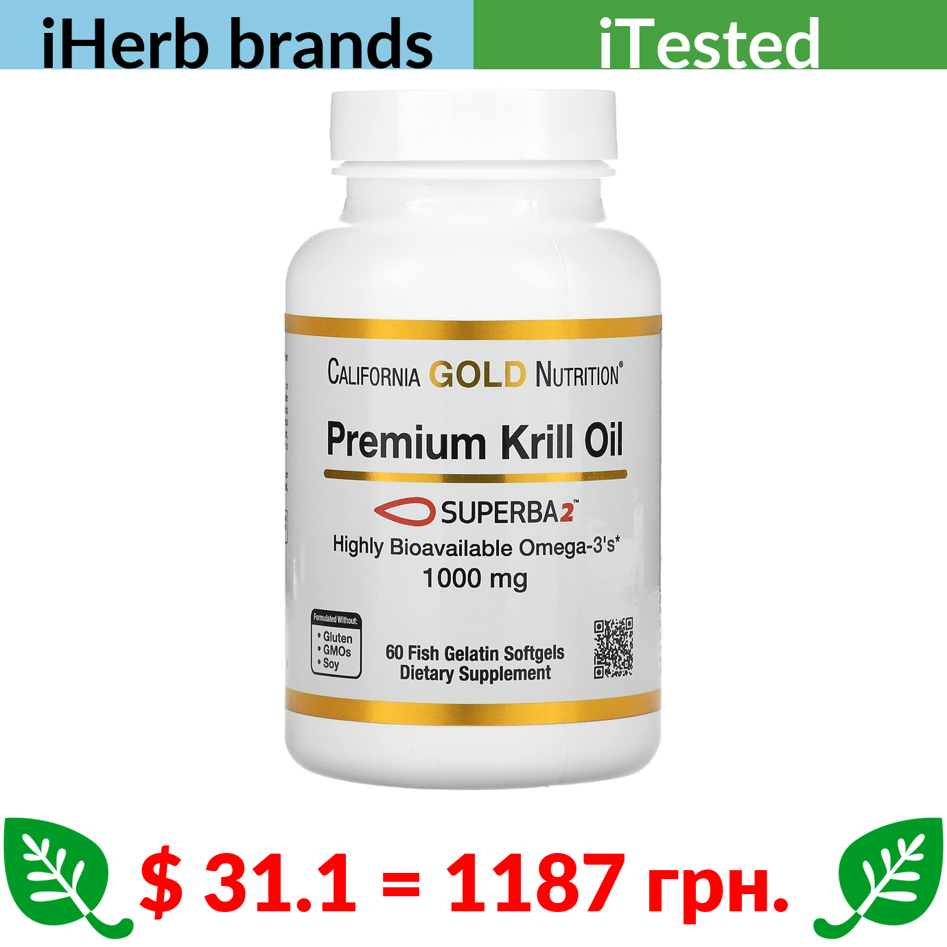 $ 31.1 = 1187 грн. California Gold Nutrition, Premium Krill Oil with Superba2, 1,000 mg, 60 Fish Gelatin Softgels