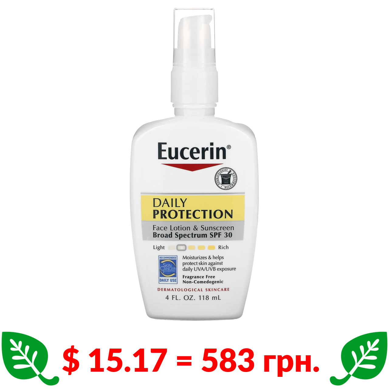 $ 15.17 = 583 грн. Eucerin, ежедневный солнцезащитный лосьон для лица, SPF 30, без отдушки, 118 мл (4 жидк. унции)