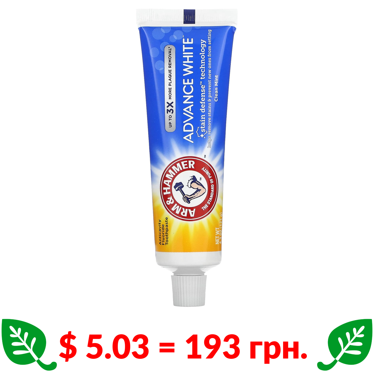 $ 5.03 = 193 грн. Арм энд Хаммер, Advance White, высокоэффективная отбеливающая зубная паста, чистый аромат мяты, 4,3 унции (121 г)
