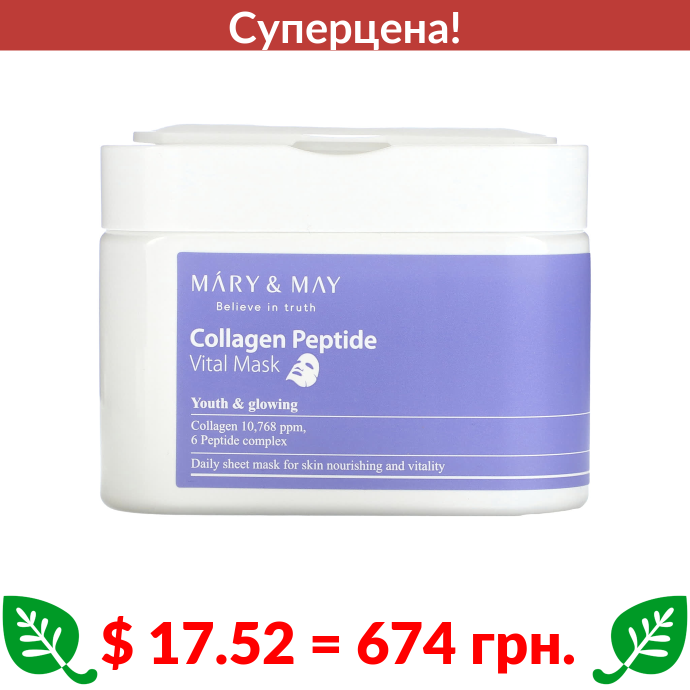 $ 17.52 = 674 грн. ???? cуперакція! ???? Mary & May, маска для лица с пептидами коллагена, 30 шт., 400 г (14,1 унции)