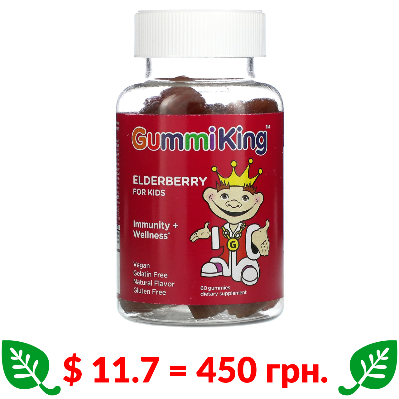 $ 11.7 = 450 грн. Гумми Кинг, Бузина для детей, для иммунитета и хорошего самочувствия, малина, 60 жевательных таблеток
