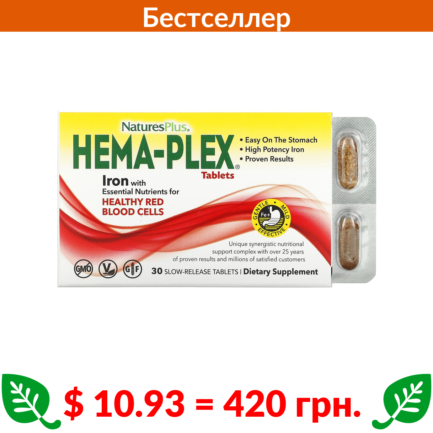 $ 10.93 = 420 грн. NaturesPlus, Hema-Plex, 30 таблеток с длительным высвобождением