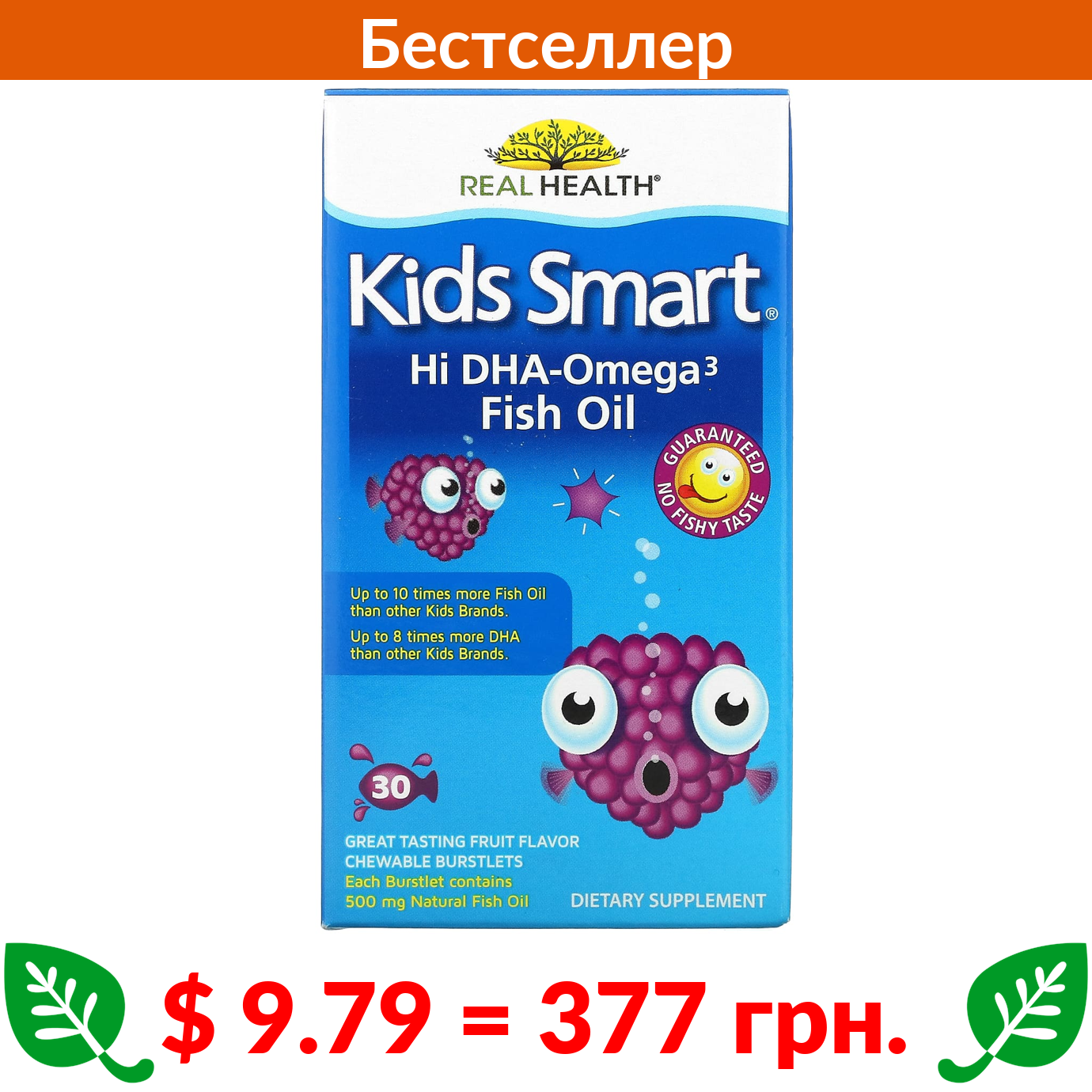 $ 9.79 = 377 грн. Байоглэн, Kids Smart, рыбий жир с высоким содержанием омега-3 и ДГК, великолепный фруктовый вкус, 30 жевательных капсул, лопающихся во рту