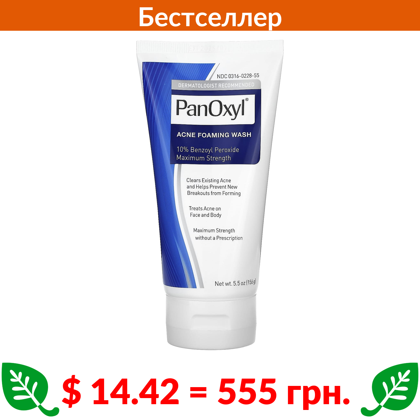 $ 14.42 = 555 грн. ПанОксил, Пенка для умывания от акне, перекись бензоила 10% максимальной концентрации, 156 г (5,5 унции)