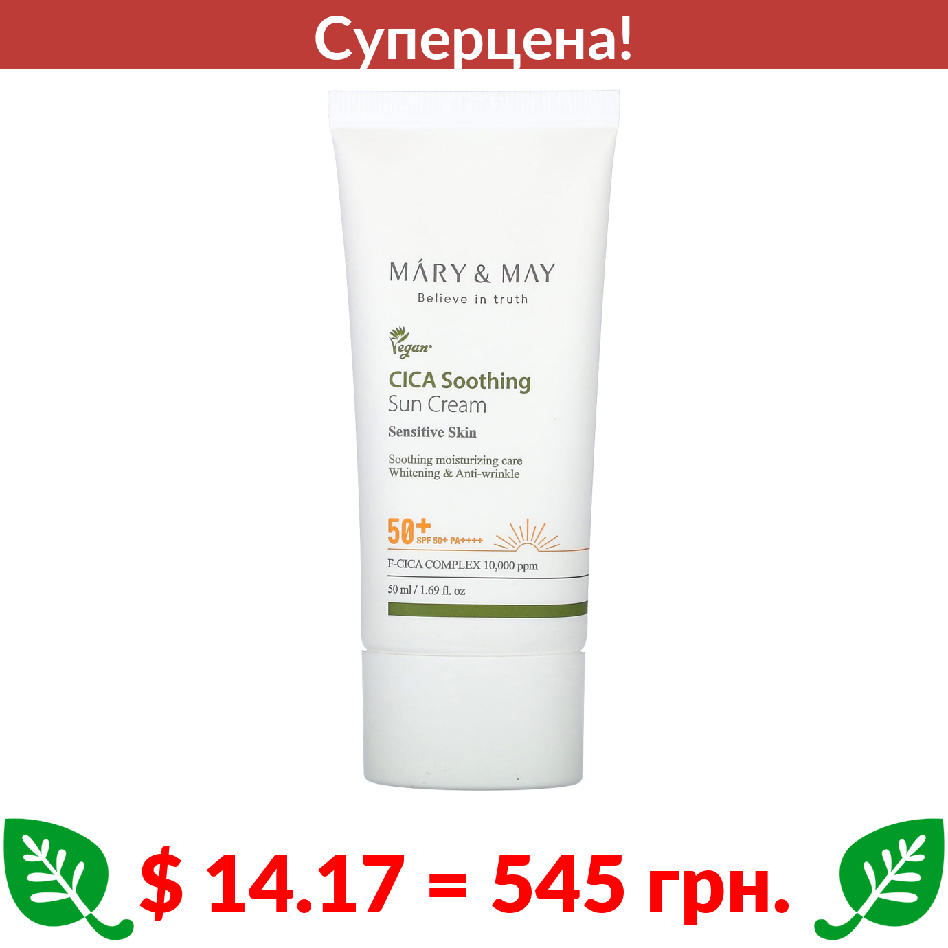 $ 14.17 = 545 грн. ???? cуперакція! ???? Mary & May, CICA Успокаивающий солнцезащитный крем, для чувствительной кожи, SPF 50+ PA ++++, 50 мл (1,69 жидк. Унции)