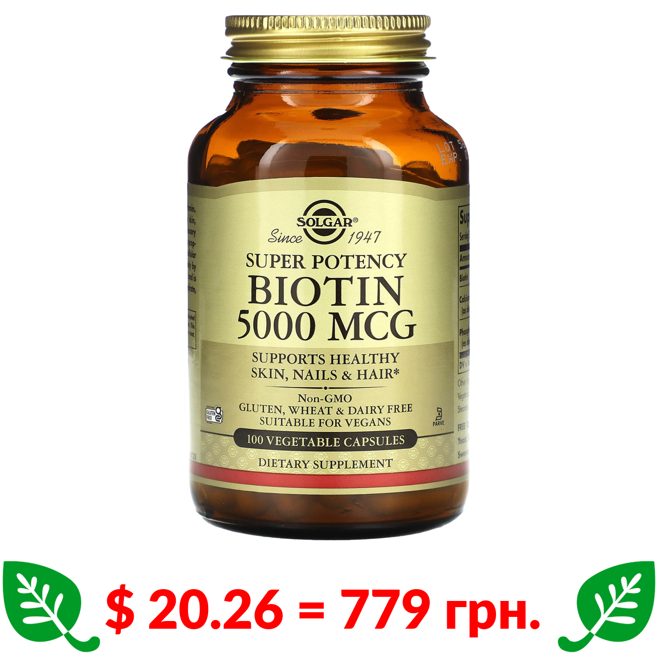 $ 20.26 = 779 грн. Солгар, биотин, 5000 мкг, 100 растительных капсул