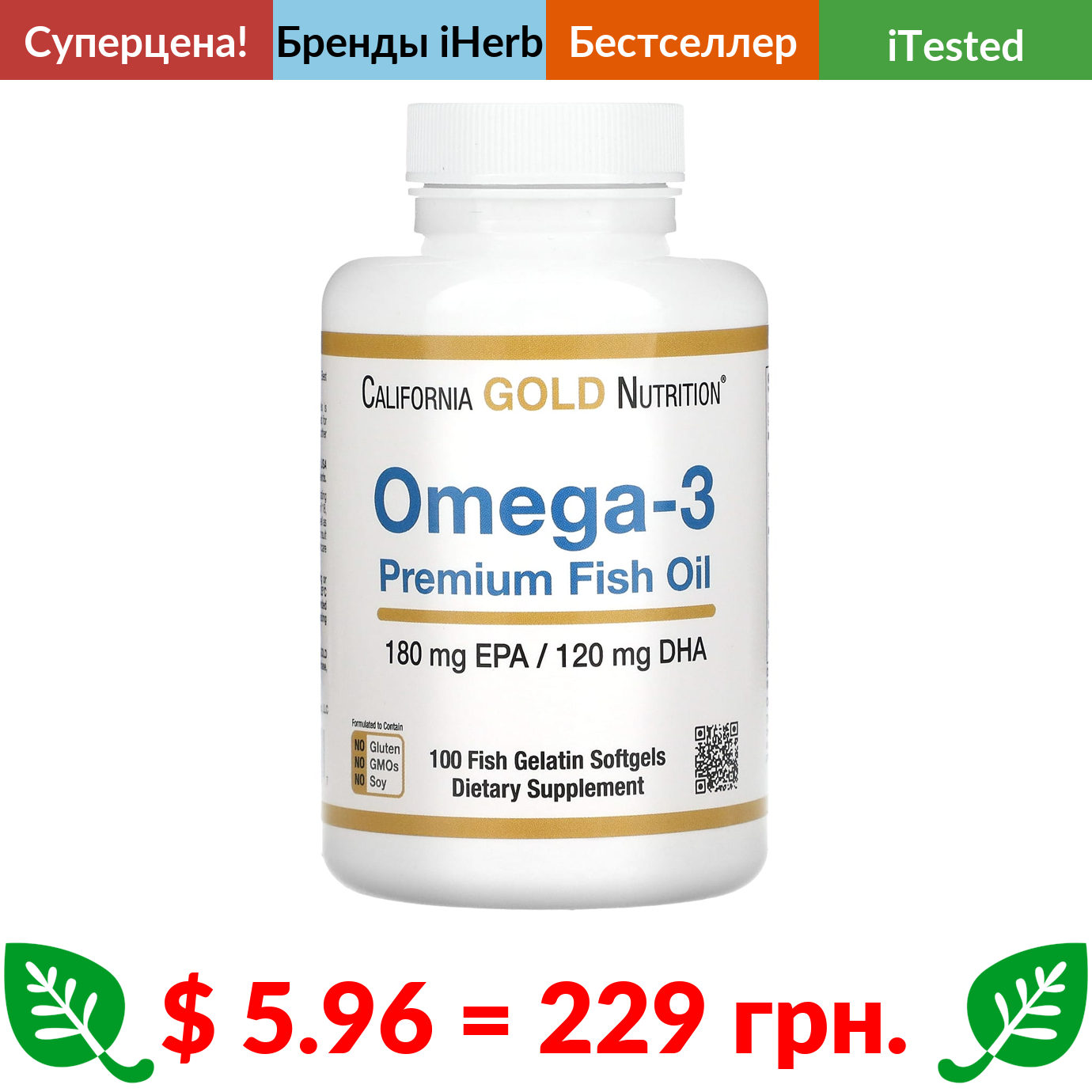 $ 5.96 = 229 грн. ???? cуперакція! ???? California Gold Nutrition, омега-3, рыбий жир премиального качества, 100 капсул из рыбьего желатина