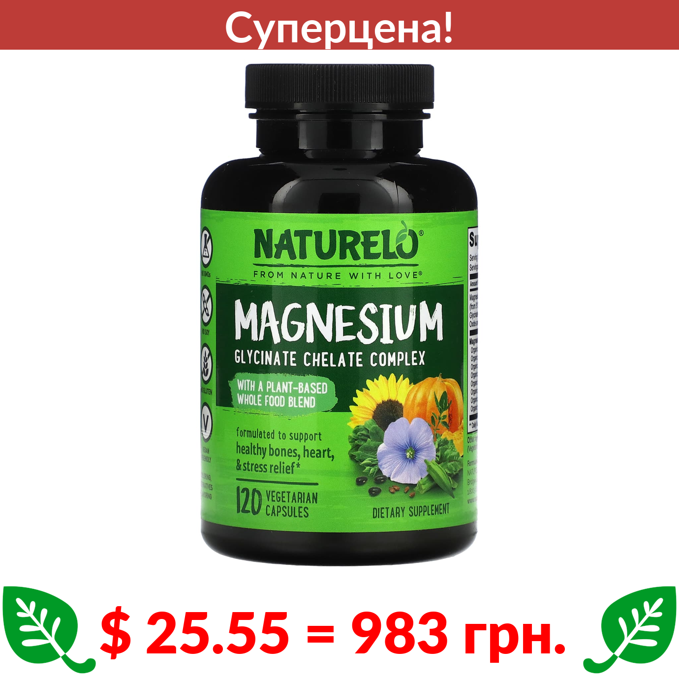 $ 25.55 = 983 грн. ???? cуперакція! ???? НАТУРЕЛО, хелат глицината магния, 200 мг, 120 вегетарианских капсул