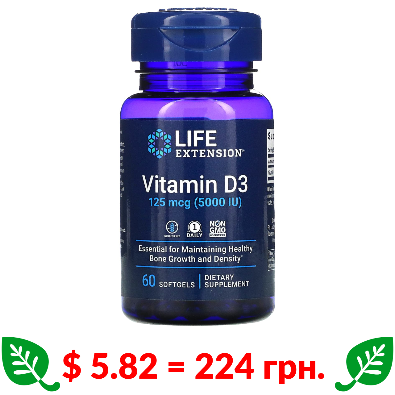 $ 5.82 = 224 грн. ????️ у кошику ????️ Life Extension, витамин D3, 125 мкг (5000 МЕ), 60 капсул