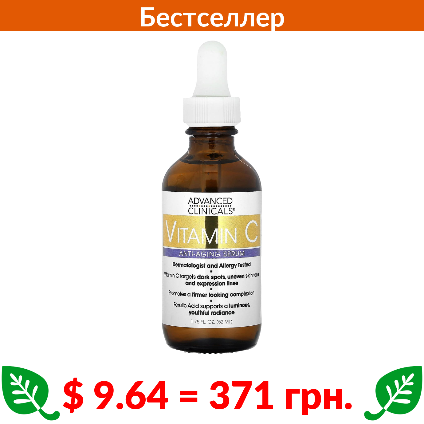 $ 9.64 = 371 грн. Advanced Clinicals, антивозрастная сыворотка с витамином C, 52 мл, (1,75 жидк. унции)