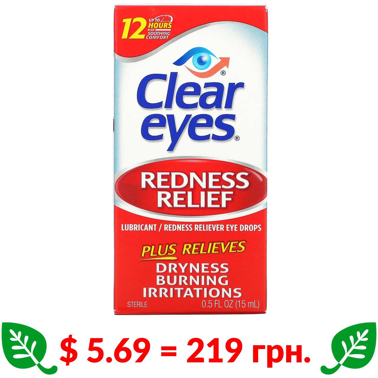 $ 5.69 = 219 грн. Clear Eyes, Redness Relief, Глазные капли смазывающее / снимающее покраснение, 0,5 жидких унций (15 мл)