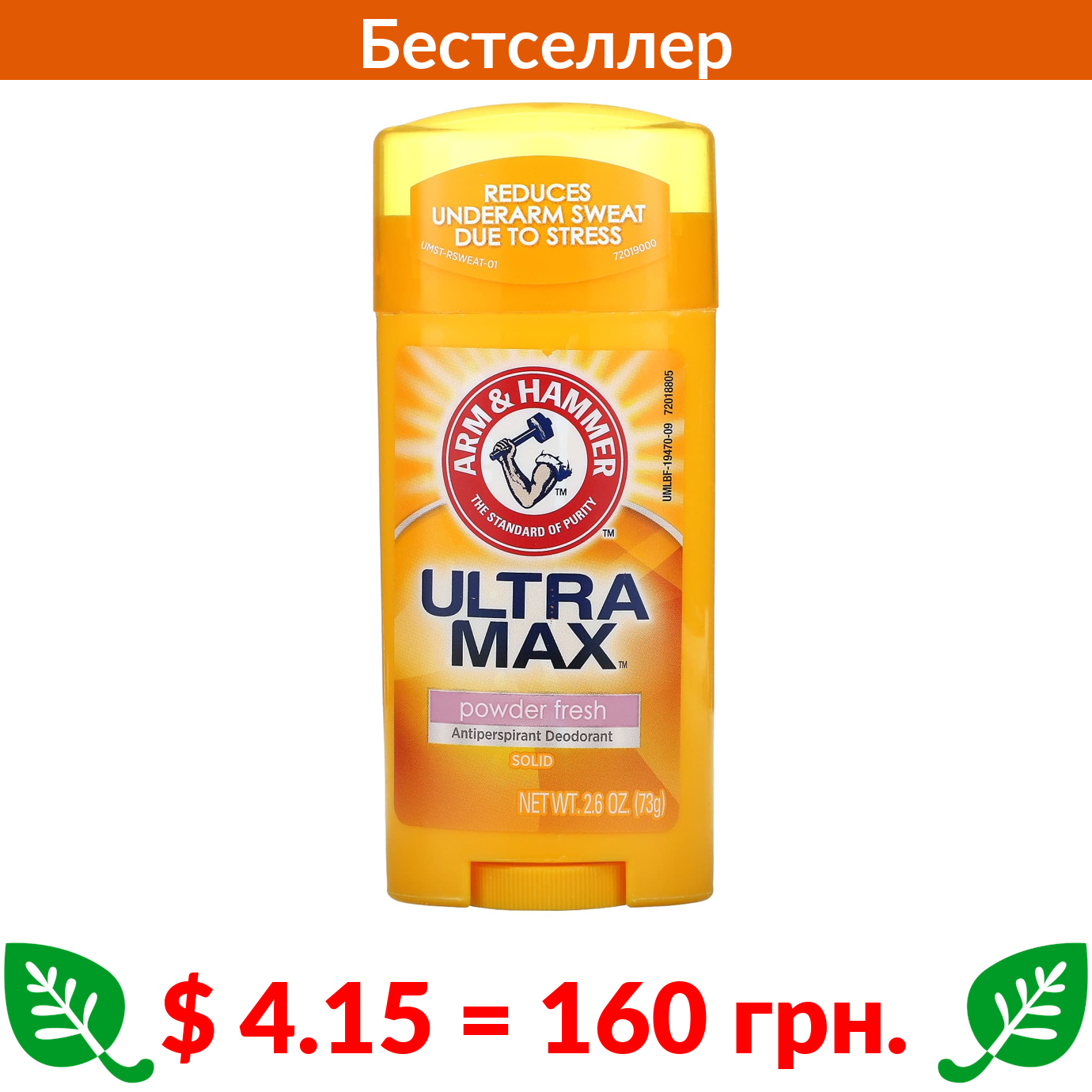 $ 4.15 = 160 грн. Арм энд Хаммер, UltraMax, твердый дезодорант-антиперспирант для женщин, свежий пудровый аромат, 73 г (2,6 унции)