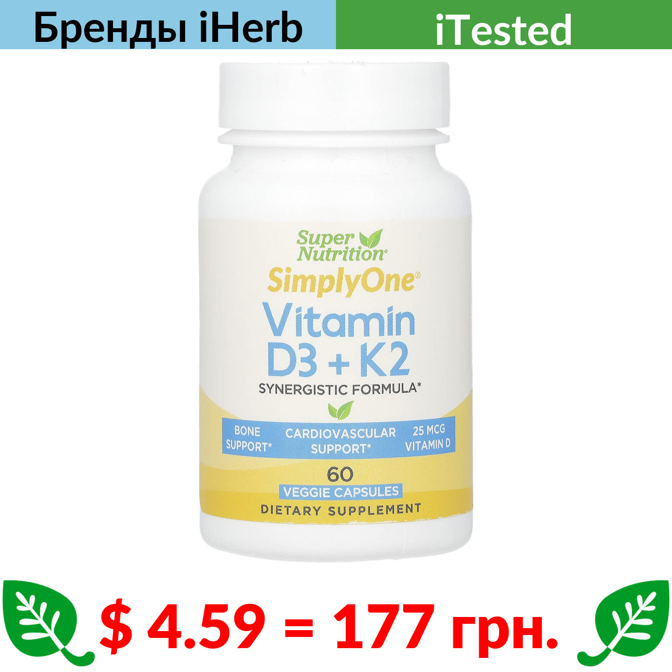 $ 4.59 = 177 грн. ????️ у кошику ????️ Super Nutrition, витамины D3 и К2, 60 растительных капсул