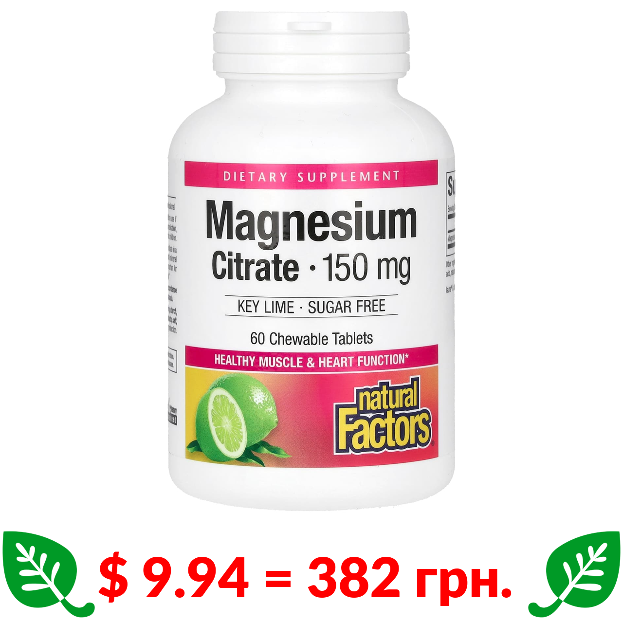 $ 9.94 = 382 грн. Natural Factors, цитрат магния, лайм, 150 мг, 60 жевательных таблеток