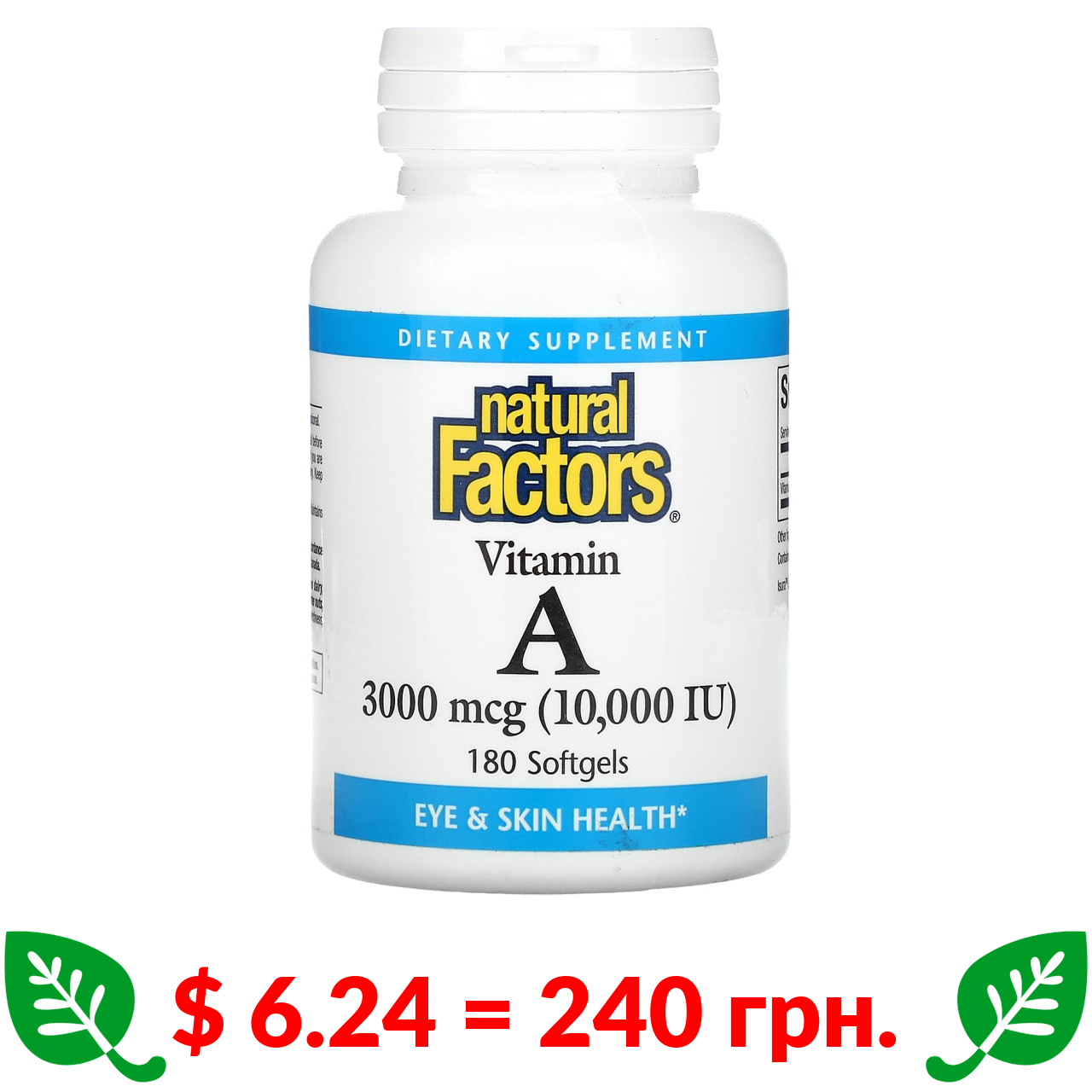 $ 6.24 = 240 грн. Natural Factors, витамин A, 3000 мкг (10 000 МЕ), 180 капсул