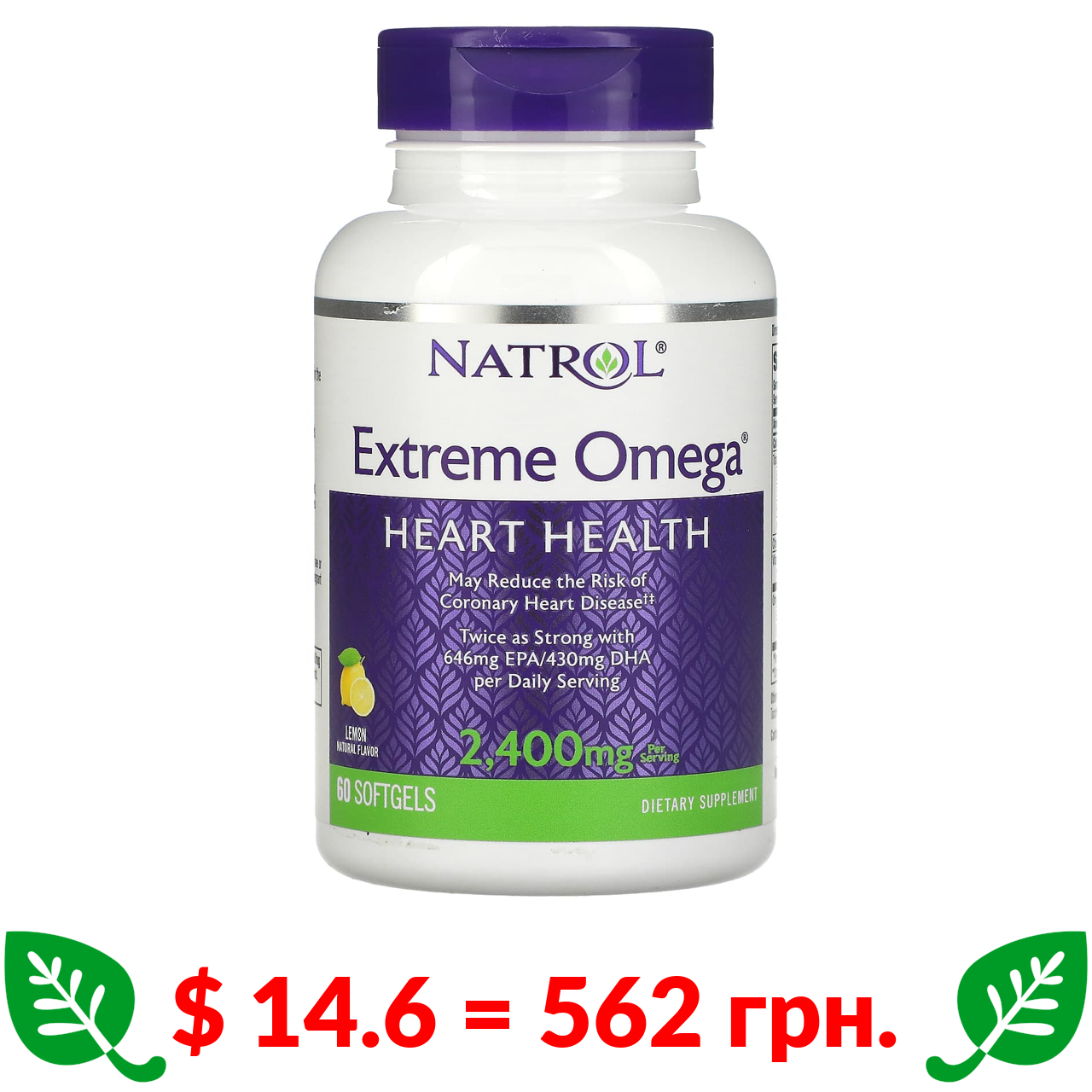 $ 14.6 = 562 грн. Натрол, Extreme Omega, со вкусом лимона, 2400 мг, 60 капсул (1200 мг в 1 капсуле)