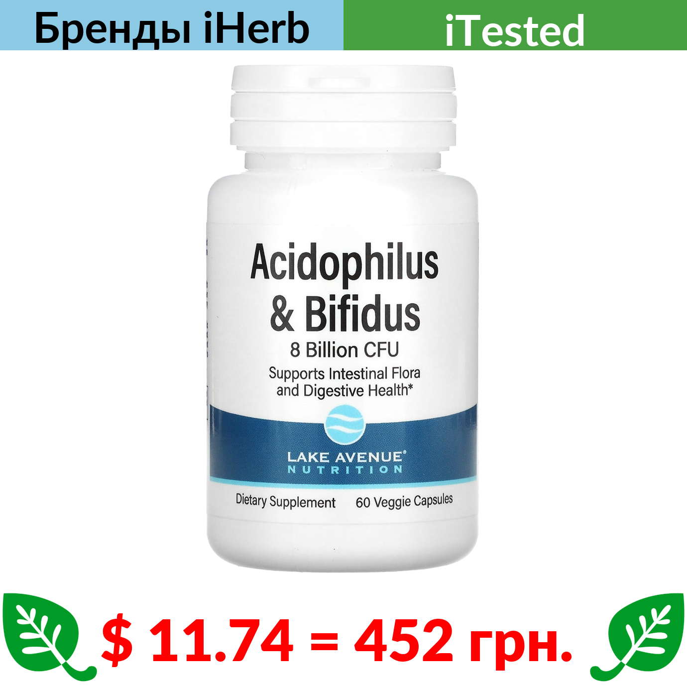$ 11.74 = 452 грн. Lake Avenue Nutrition, пробиотики Acidophilus и Bifidus, смесь пробиотиков, 8 млрд КОЕ, 60 растительных капсул