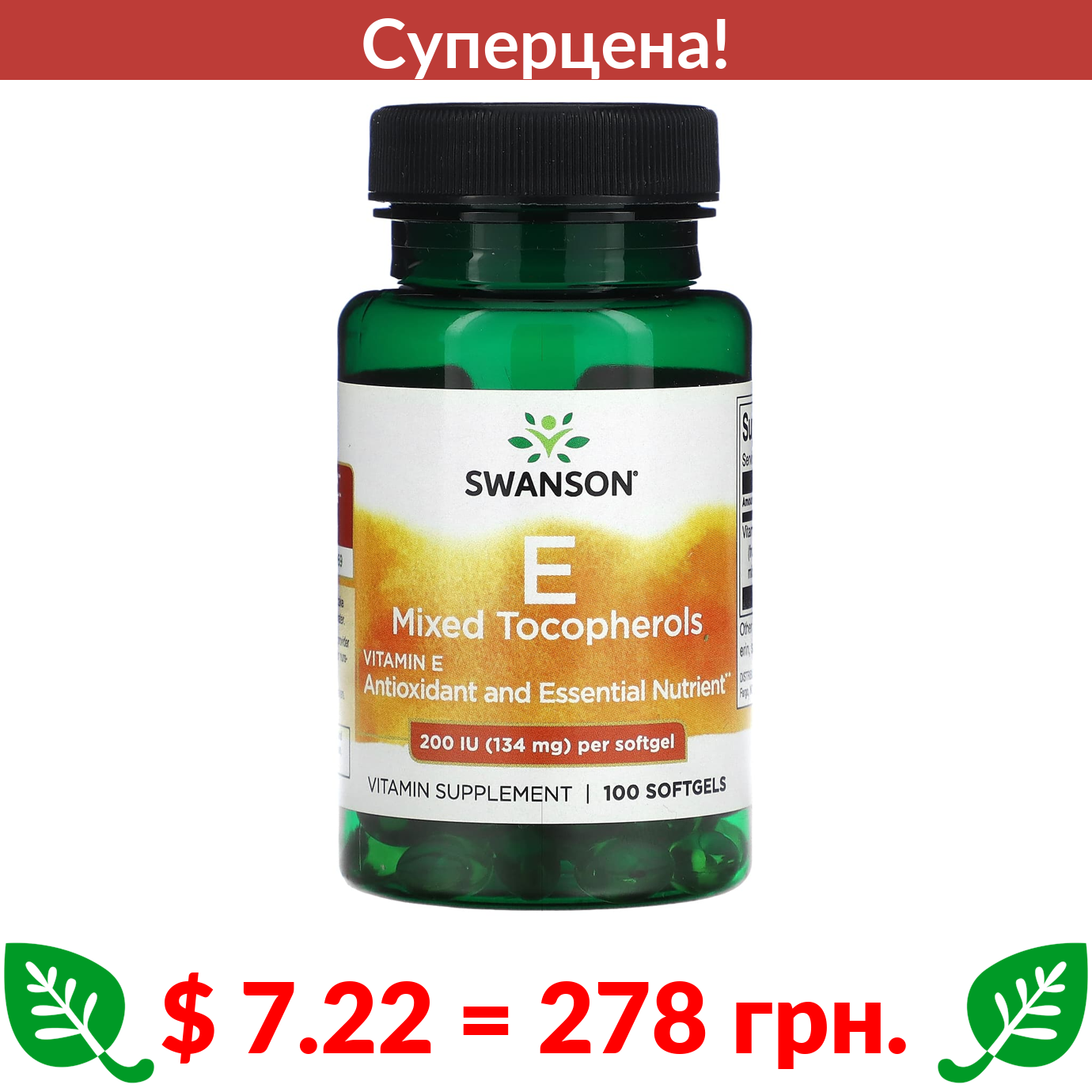 $ 7.22 = 278 грн. ???? cуперакція! ???? Swanson, Смесь токоферолов с витамином E, 200 МЕ (134 мг), 100 мягких таблеток