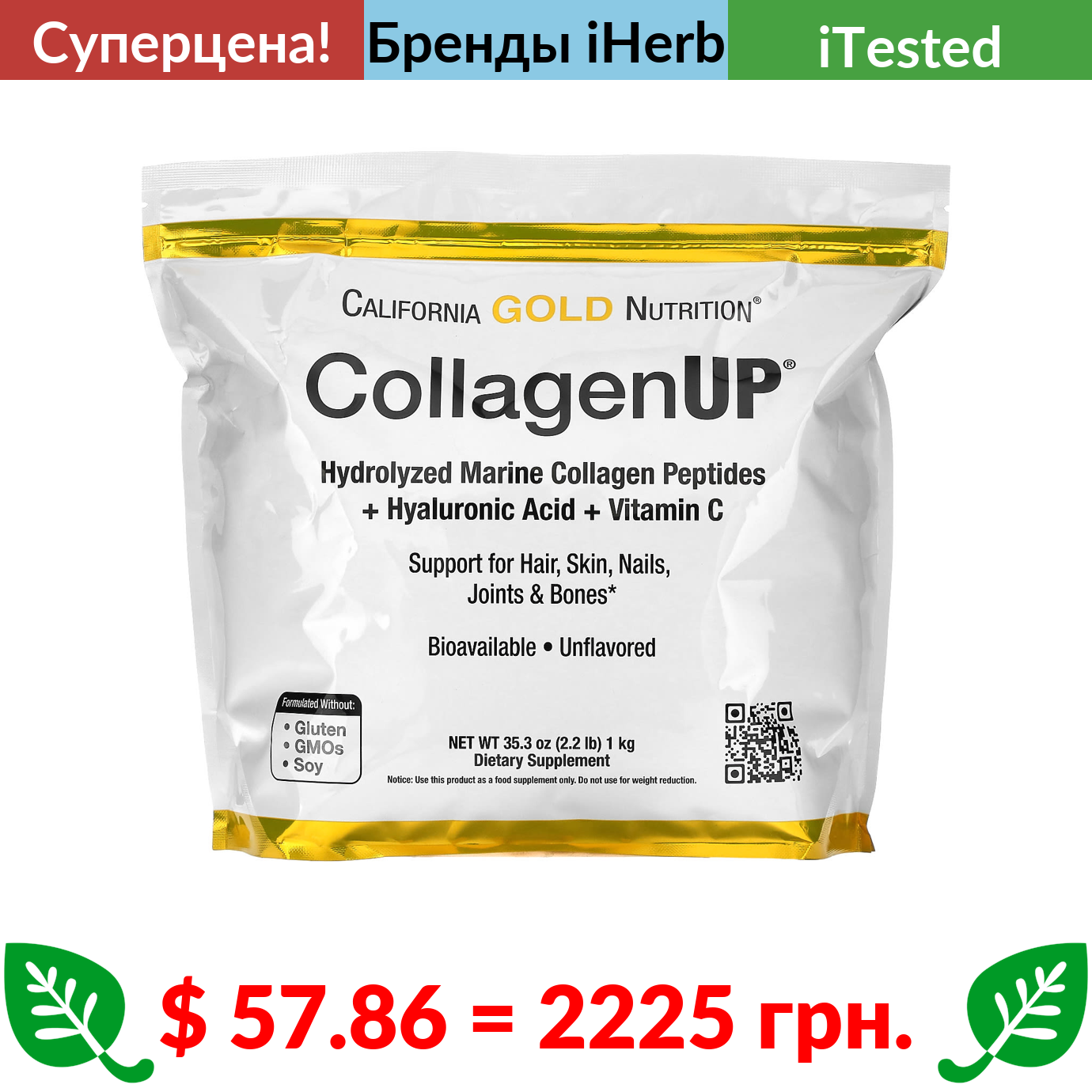 $ 57.86 = 2225 грн. ???? cуперакція! ???? California Gold Nutrition, CollagenUP, гидролизованные пептиды морского коллагена с гиалуроновой кислотой и витамином C, без добавок, 1 кг (2,2 фунта)