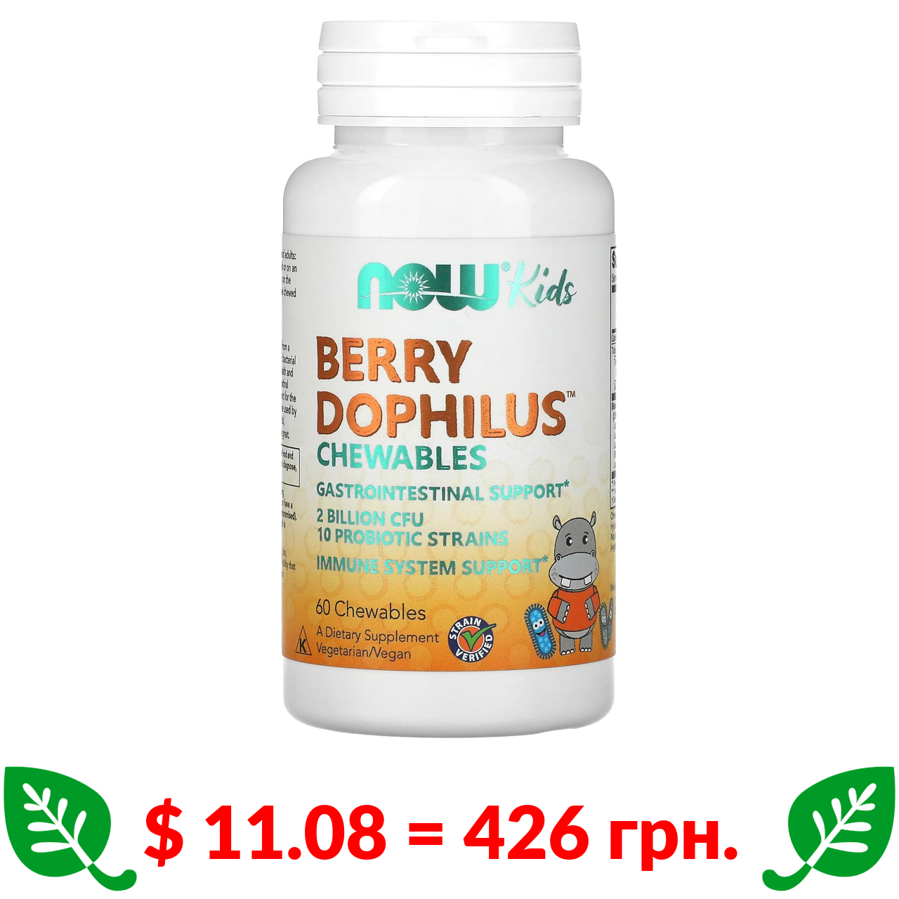 $ 11.08 = 426 грн. Now Foods, Berry Dophilus, детский, 2 миллиарда, 60 жевательных таблеток