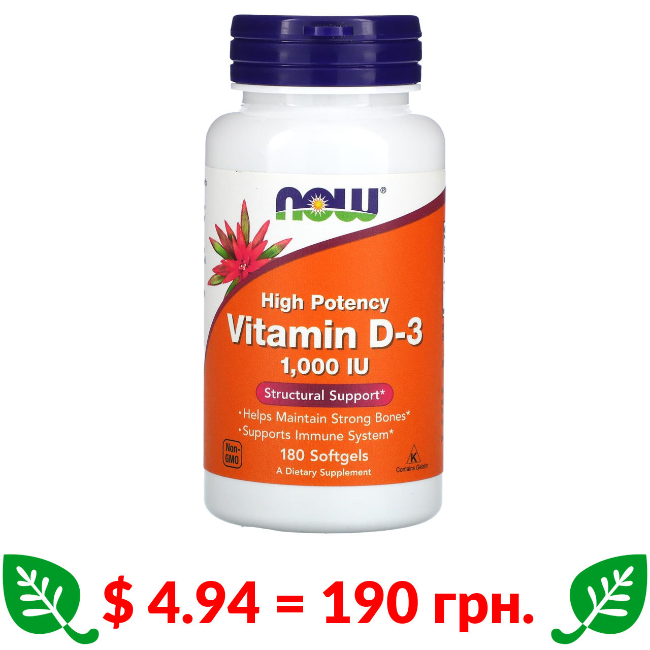 $ 4.94 = 190 грн. ????️ у кошику ????️ Now Foods, витамин D3, высокоактивный, 1000 МЕ, 180 мягких таблеток