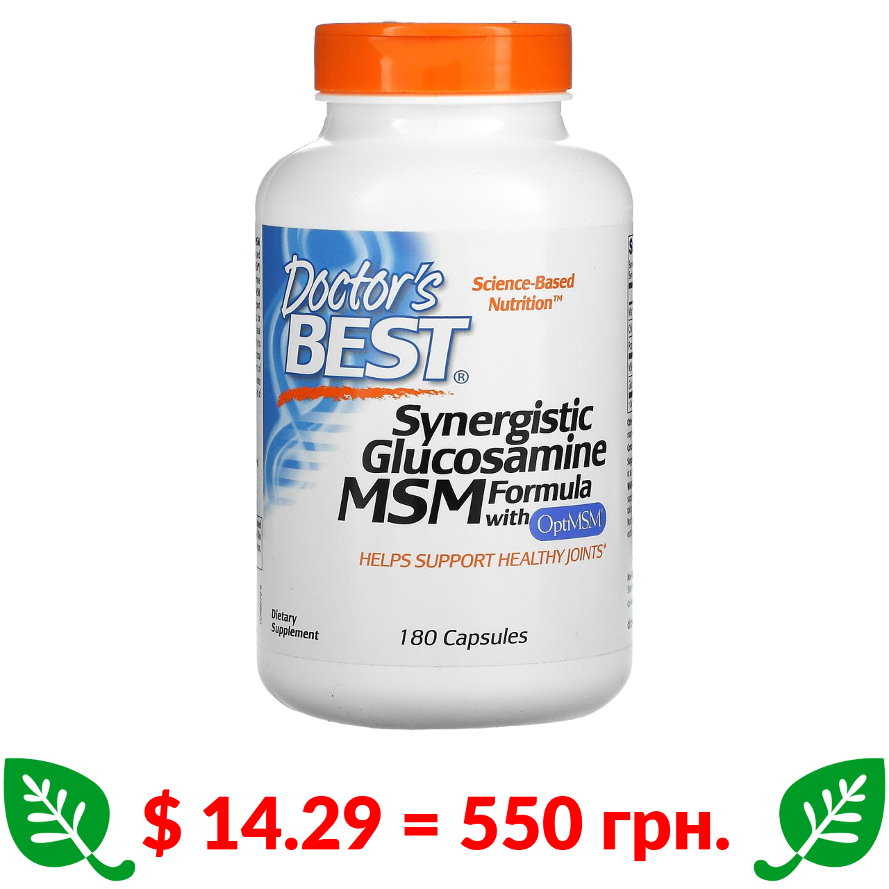 $ 14.29 = 550 грн. Докторс Бэст, синергетическая формула глюкозамина и МСМ с OptiMSM, 180 капсул