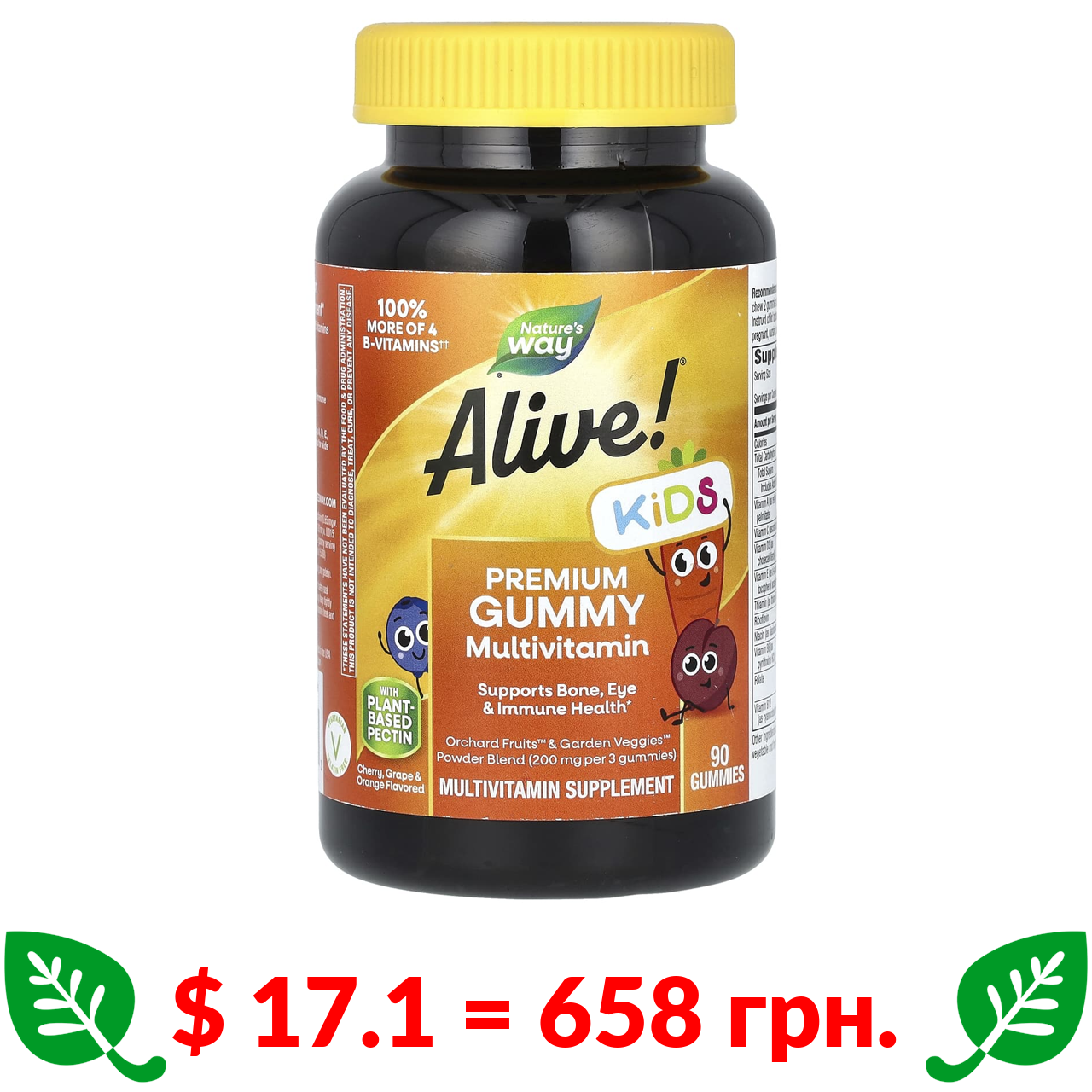 $ 17.1 = 658 грн. Натурес Вэй, Alive! для детей, жевательные мультивитамины премиального качества, вишня, виноград и апельсин, 90 жевательных таблеток