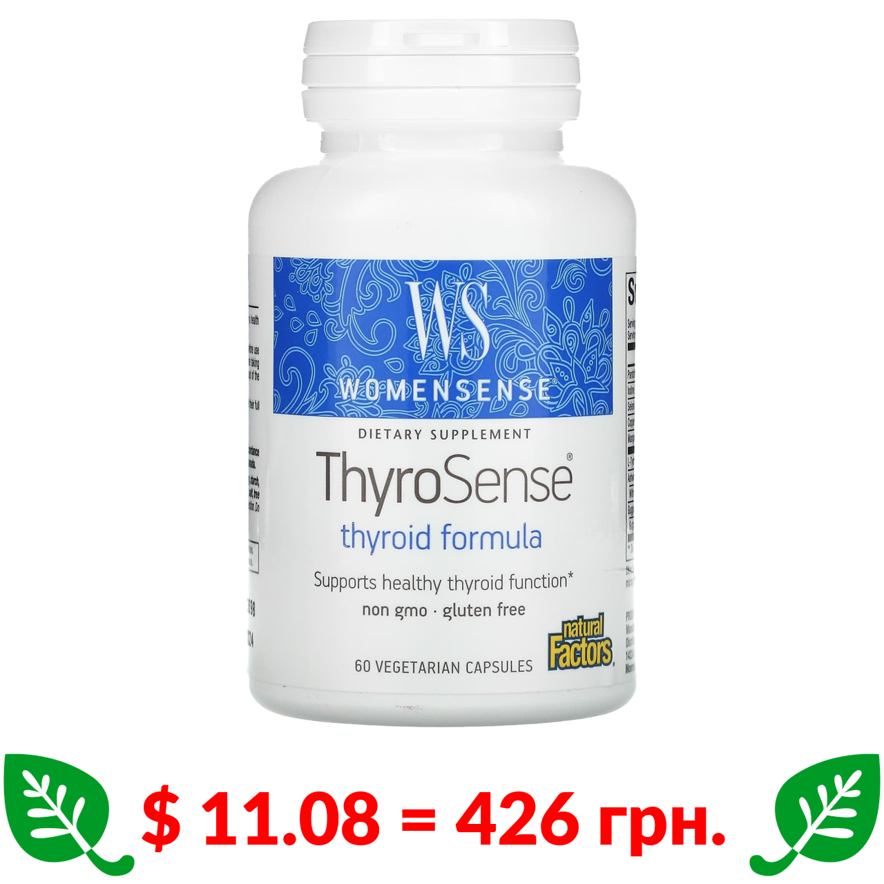 $ 11.08 = 426 грн. Natural Factors, WomenSense, ThyroSense, средство для щитовидной железы, 60 вегетарианских капсул