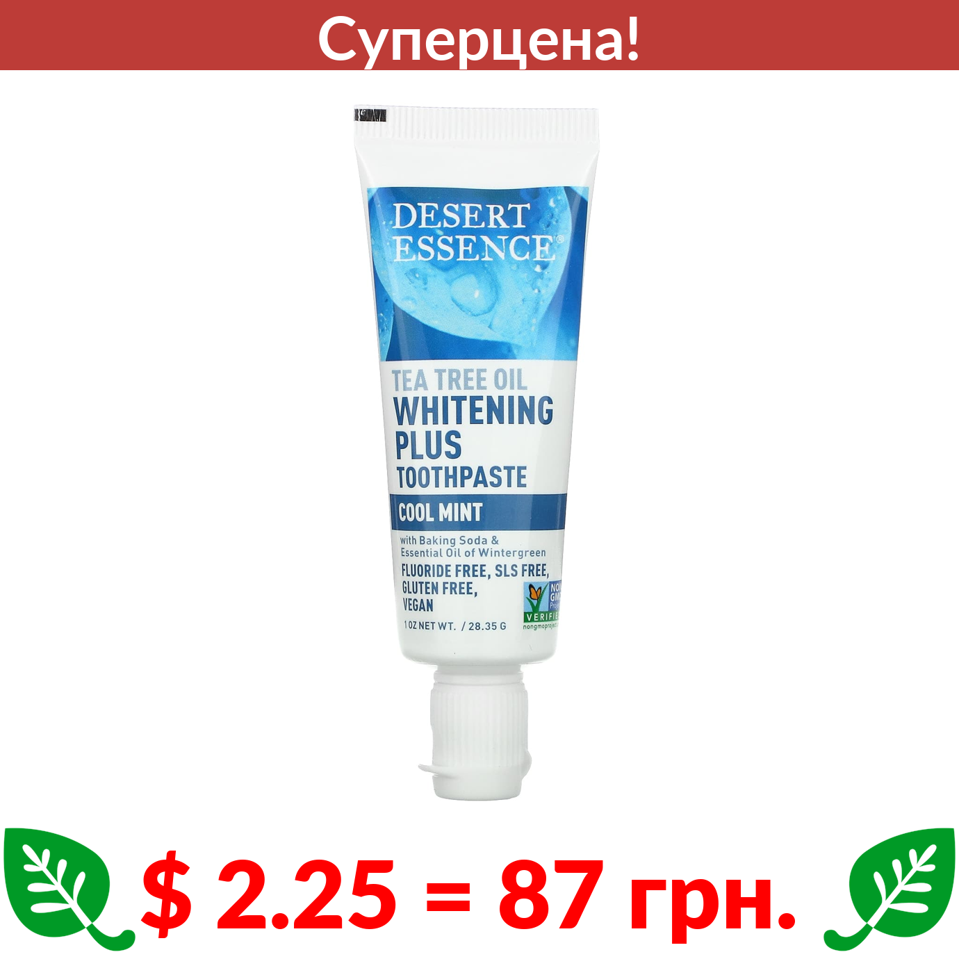 $ 2.25 = 87 грн. ???? cуперакція! ???? Desert Essence, Отбеливающая зубная паста с маслом чайного дерева, мята, 28,35 г (1 унция)