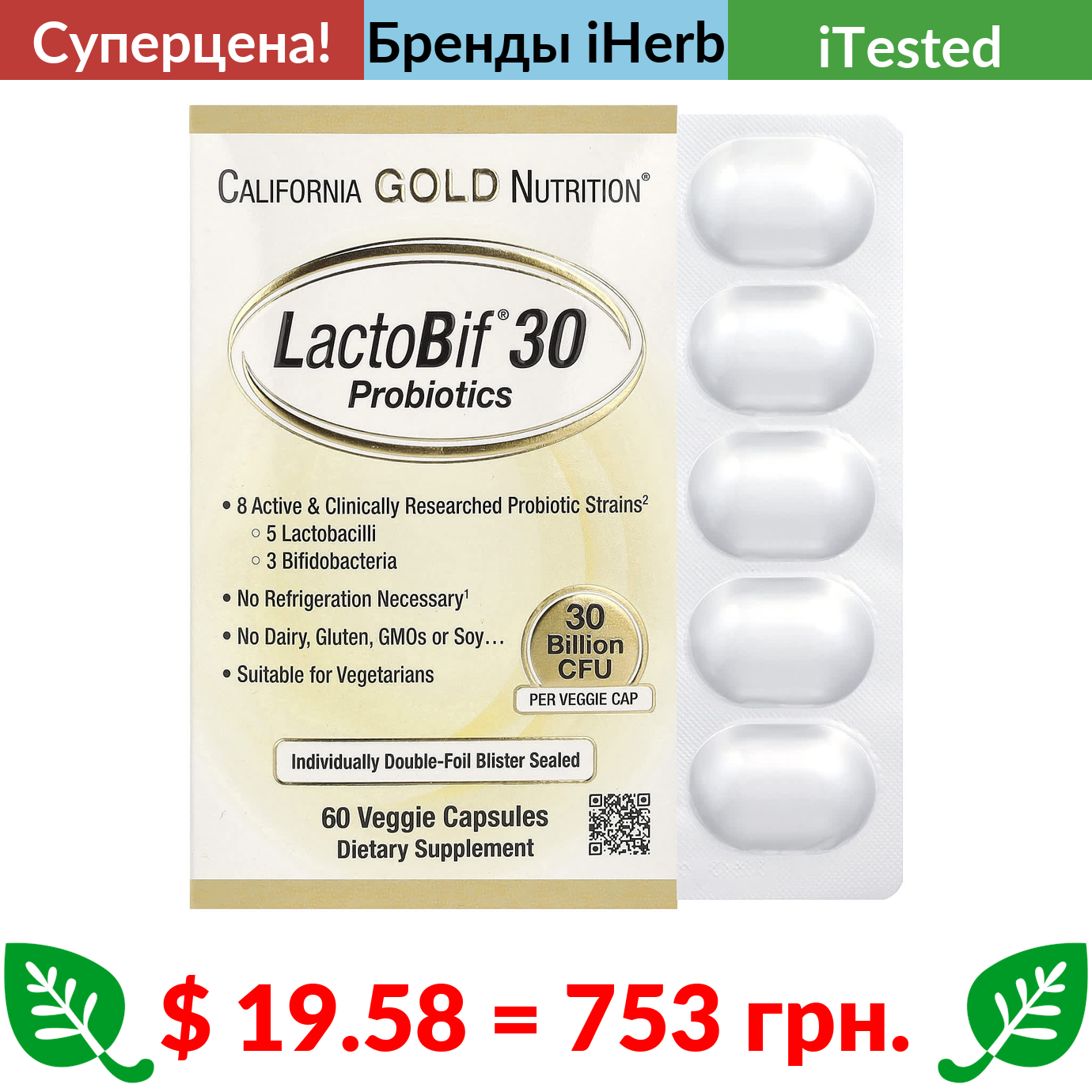 $ 19.58 = 753 грн. ???? cуперакція! ???? California Gold Nutrition, LactoBif, пробиотики, 30 млрд КОЕ, 60 вегетарианских капсул